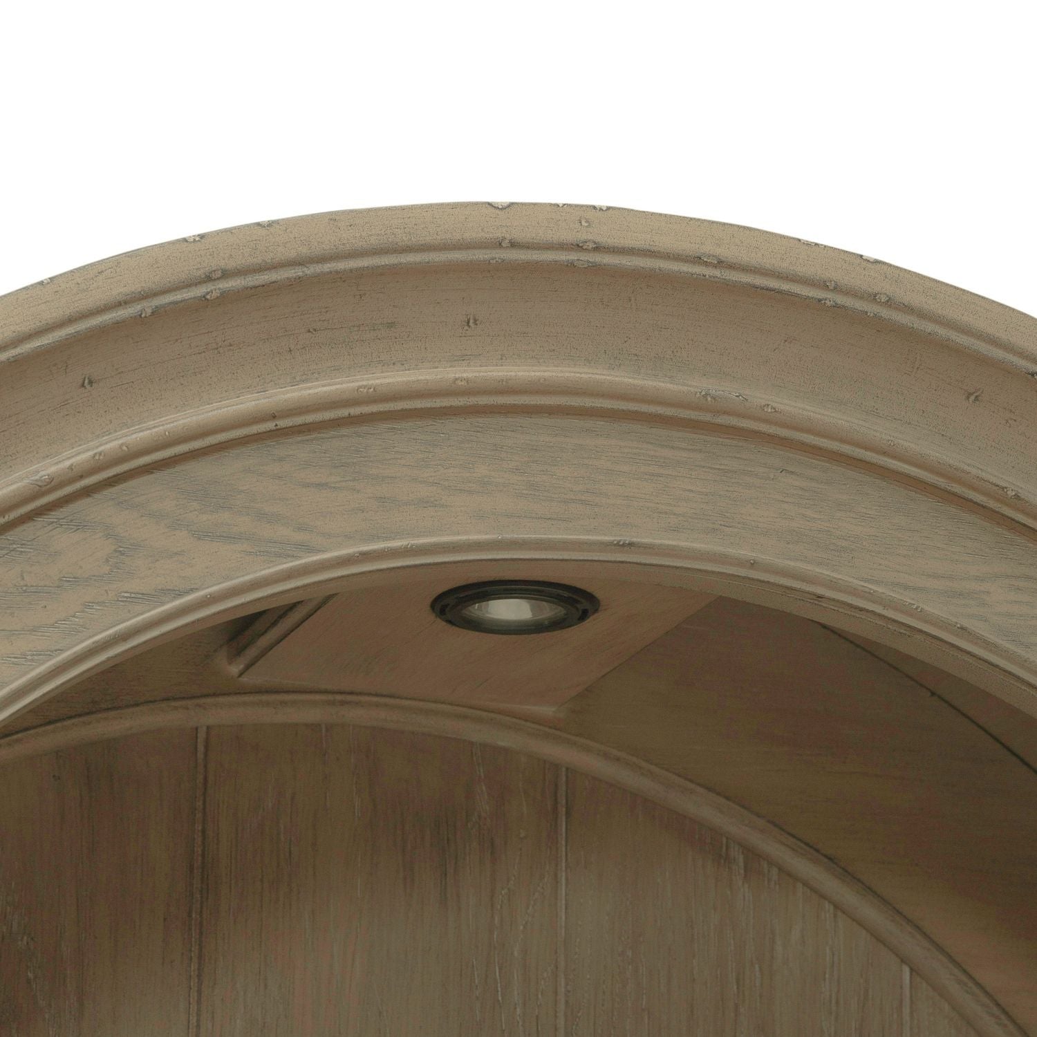 Features planked back panel, two wood framed adjustable shelves, heavily craved bonnet top and LED touching lighting. Cannot stand alone. Pair with the buffet to make a complete set.