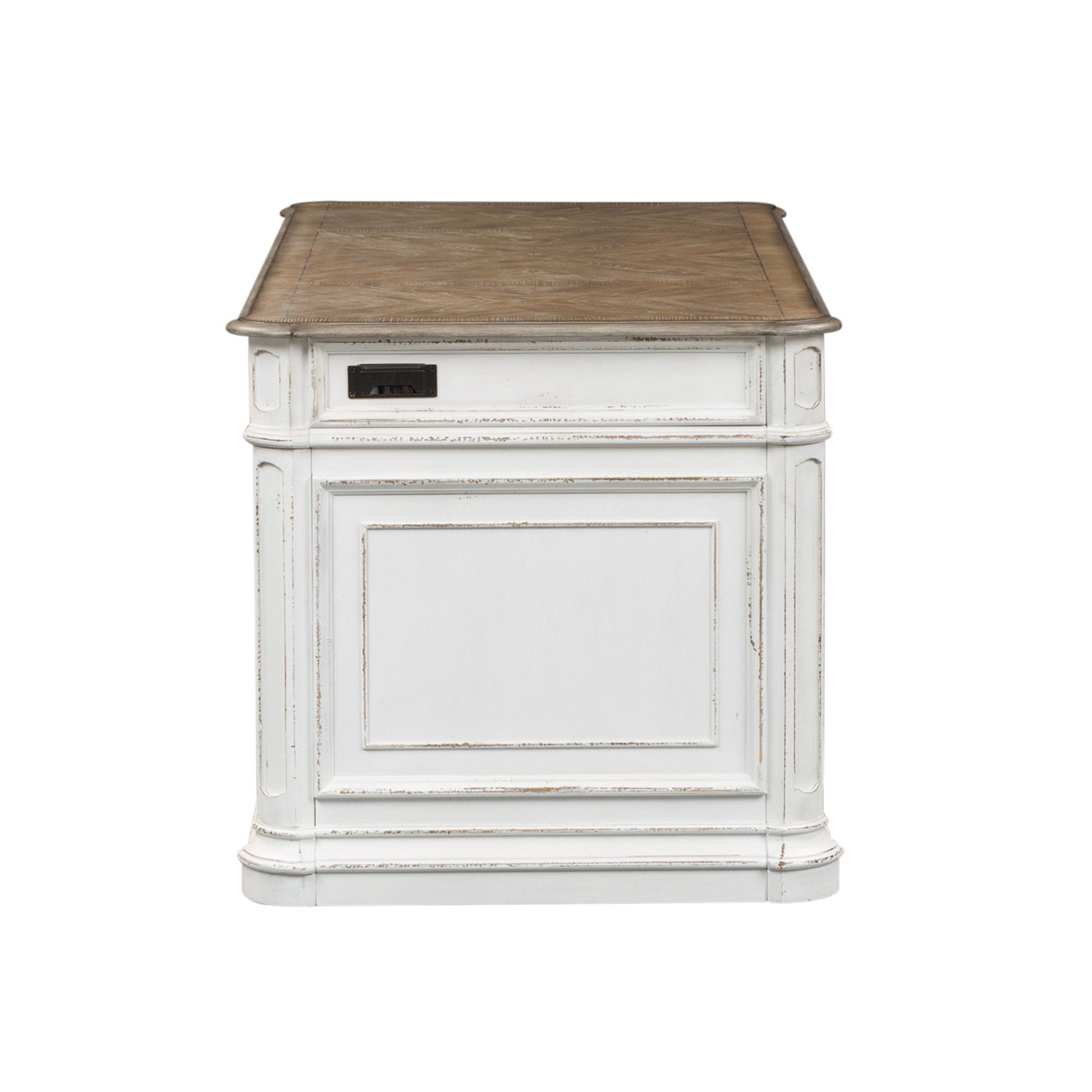 Features flip down keyboard tray, two lockng file drawer and four additional drawers for storage. All drawers are full extension. Also offers rounded pilasters, bead molding, wire management provisions, finished in heavily distressed antique white. Cannot stand alone. Pair with the top for a complete desk.