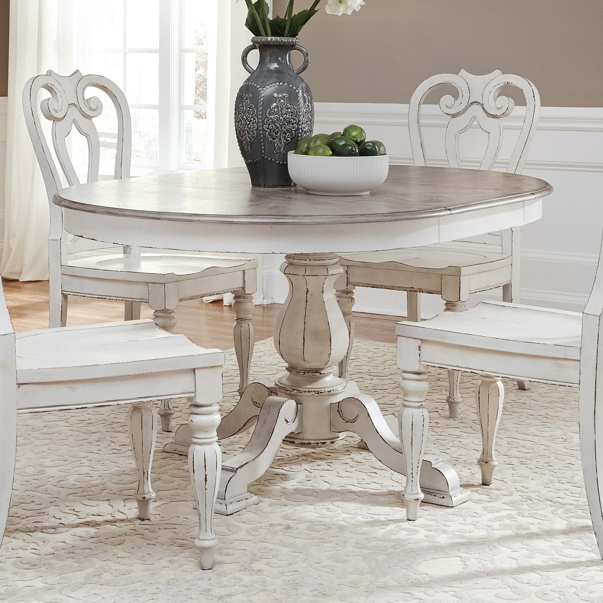 Gather the family together for dinner around the Magnolia Manor pedestal table base. Crafted of poplar solids the pedestal table base features a faceted turned based finished in an antique white with heavy chipping that is accented by splayed feet. Perfect for any decor from farmhouse to cottage living.