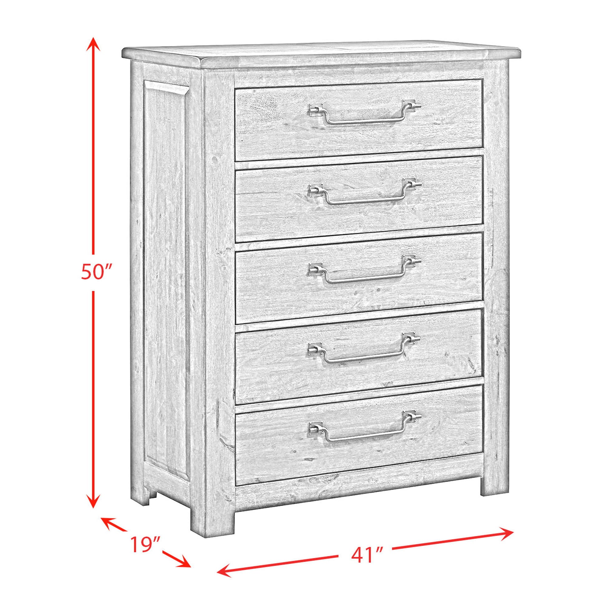 The Maverick 5-Drawer Chest in Grey delivers rustic and cozy style to your sleeping space. Features distressing and wood grain detailing throughout for that warm feel. Constructed of sturdy solid and manufactured woods for years of use. Perfect neutral finish for adding to your existing bedroom aesthetic. Complete the look by adding the Maverick Panel Bed to your bedroom.