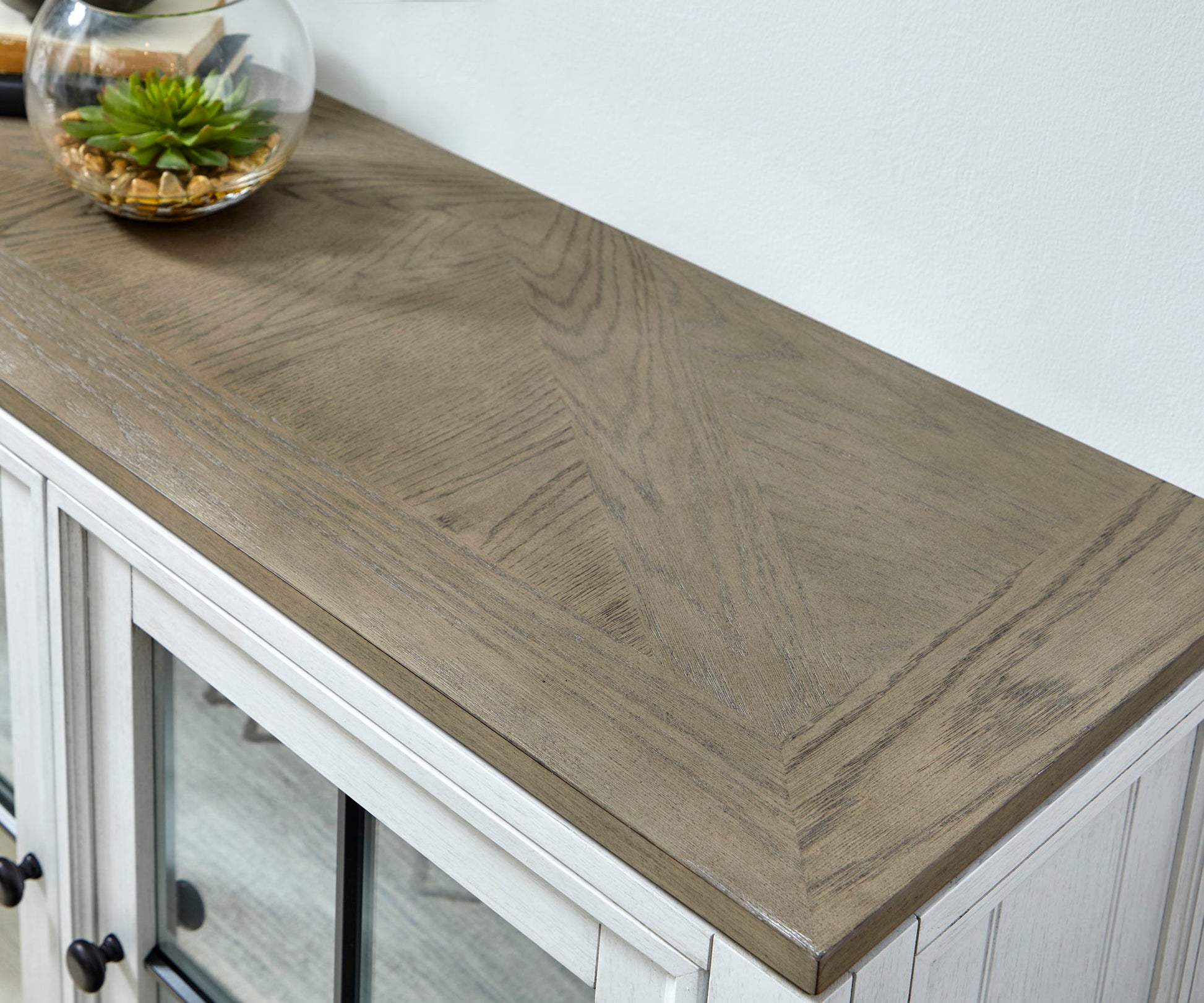 - Subtly distressed white finish with a gray parquet stained top