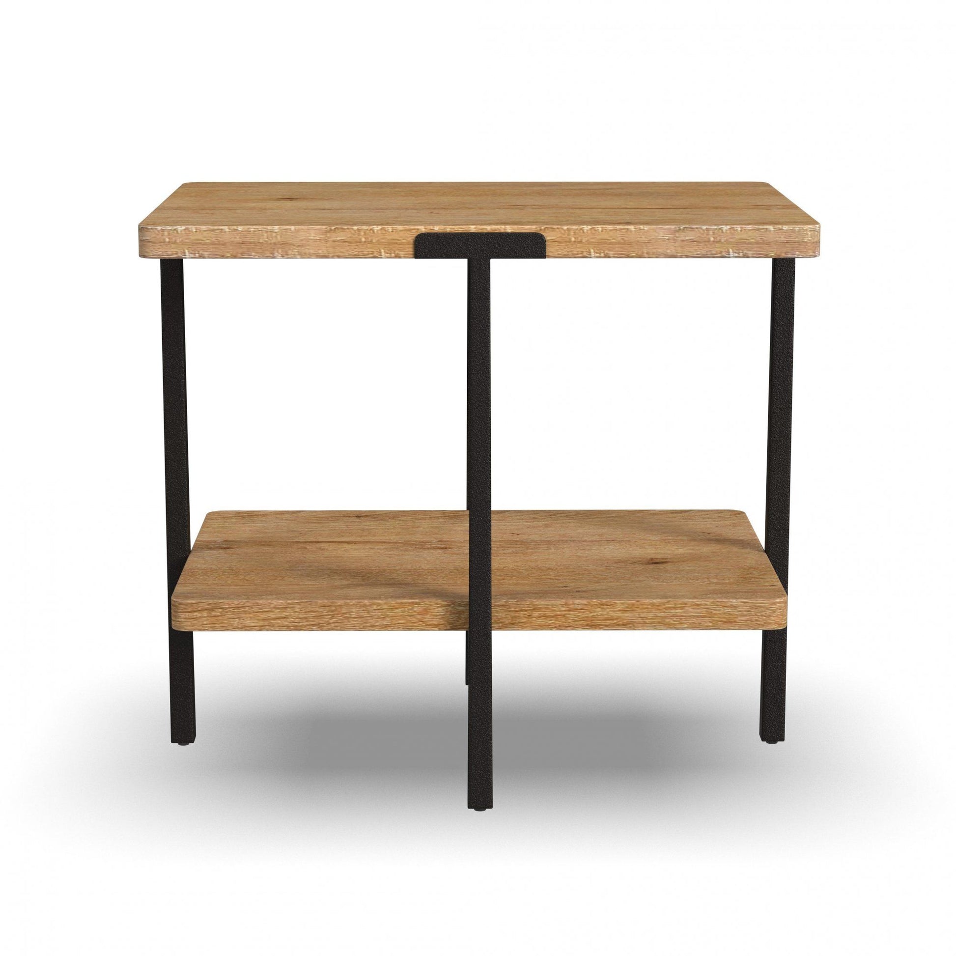 Sophistication meets rustic, industrial charm with the Millwork rectangular end table. Seamlessly blending high-contrast materials and finishes in perfect harmony, this table makes a captivating statement in any living space. A textured steel frame is highlighted by warm copper undertones, while a distinctive wood top and lower shelf exude character with natural knots, subtle saw marks and a white cerused finish that accentuates the rich umber wood grain.