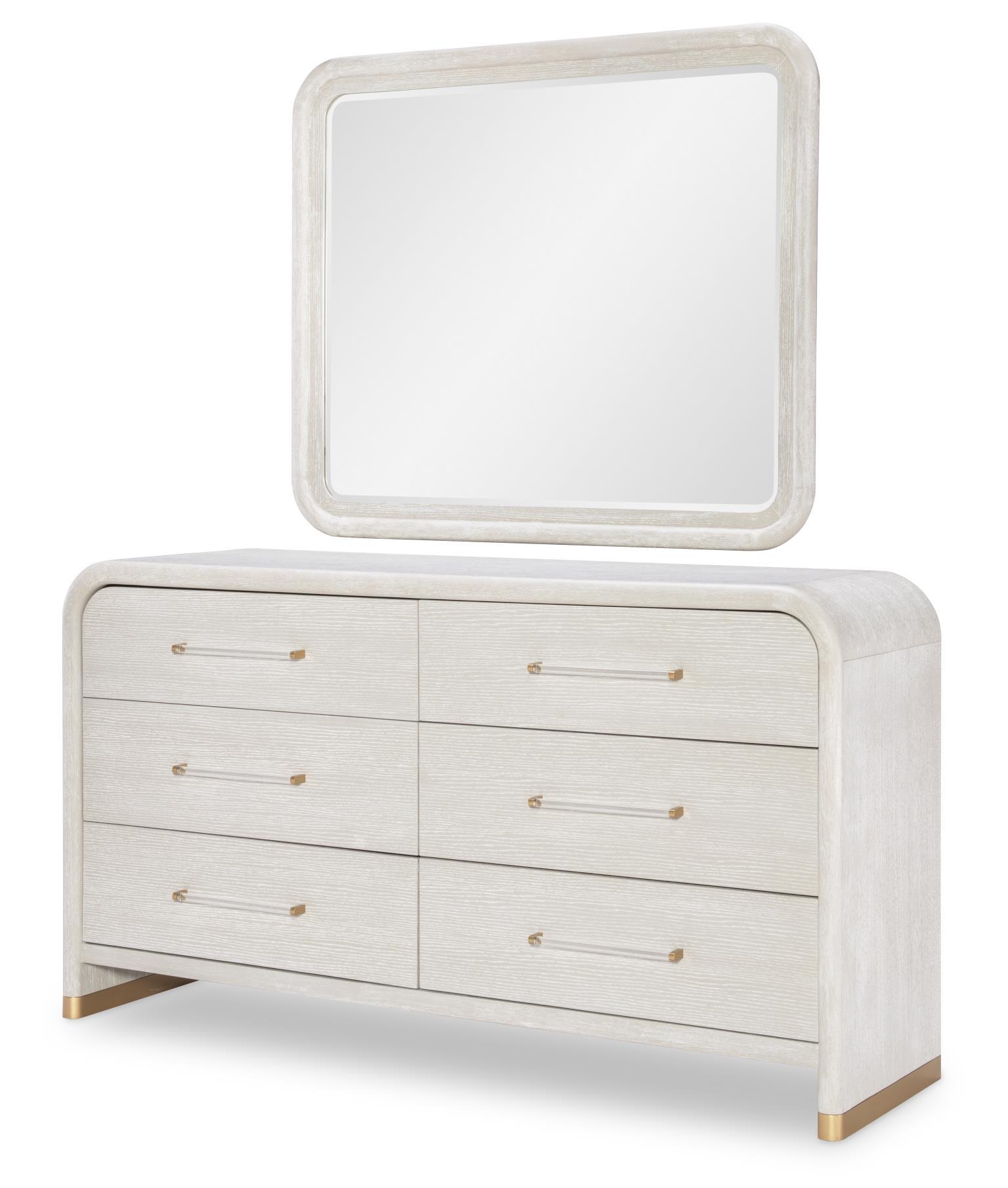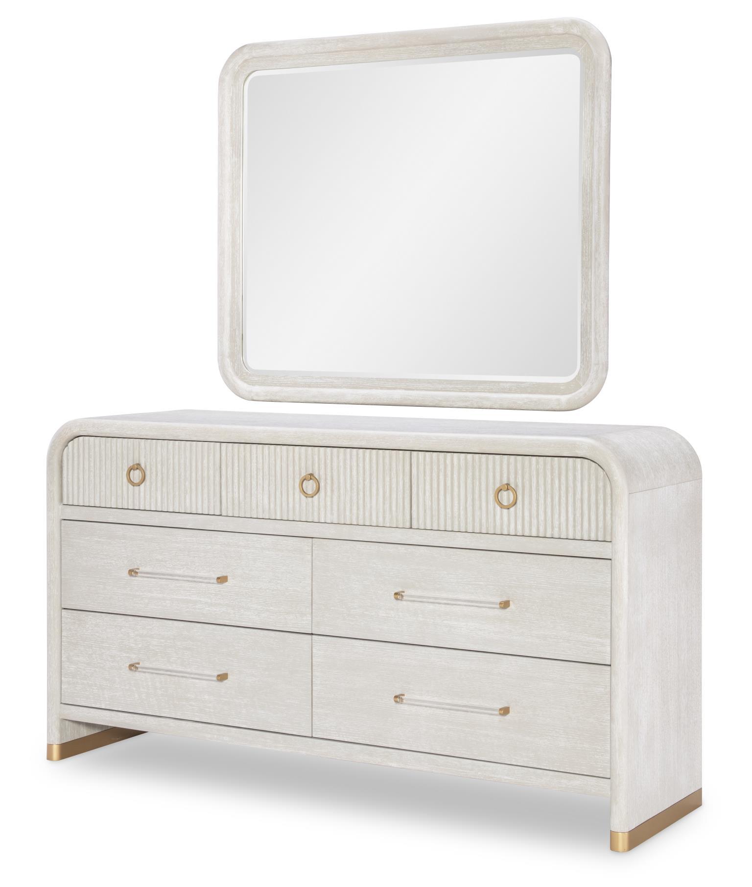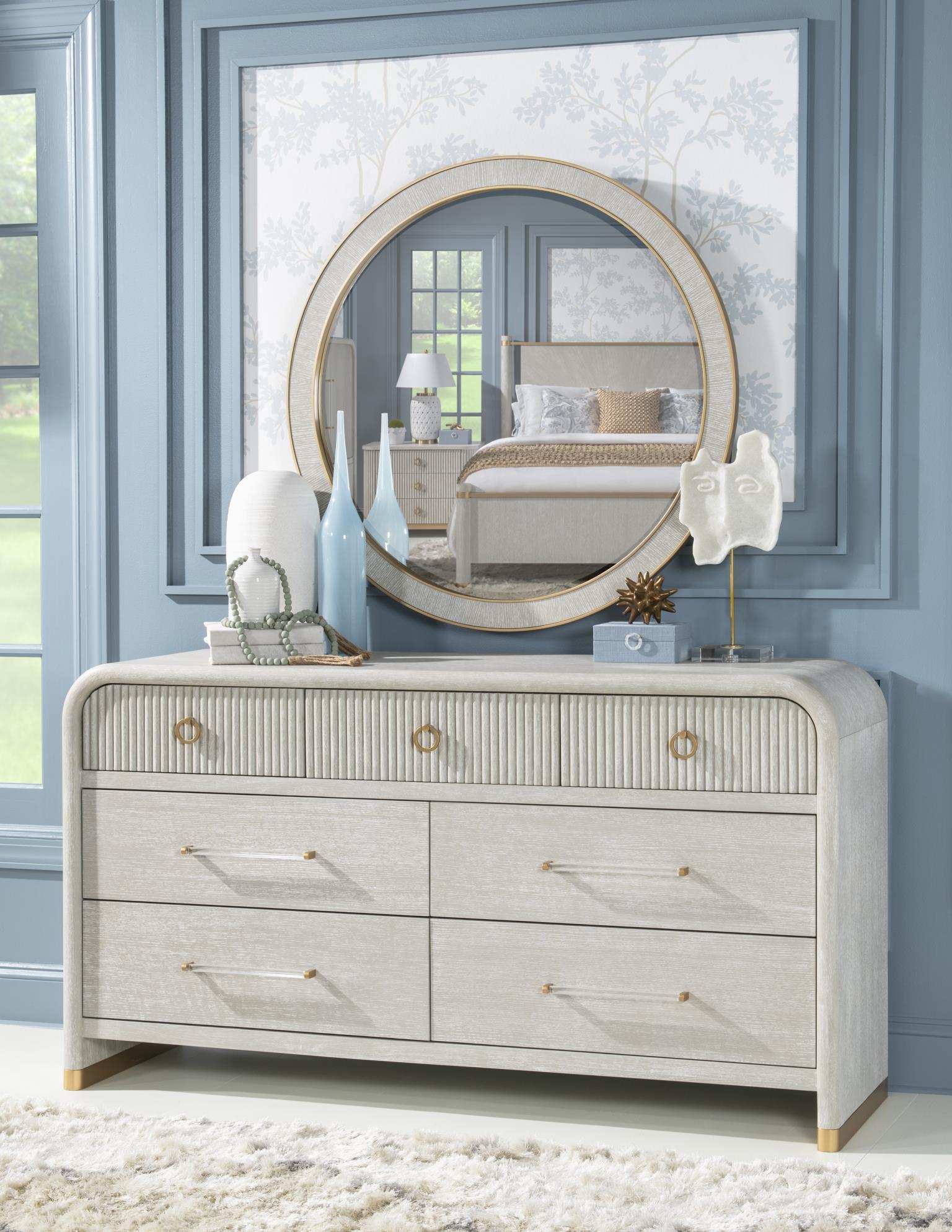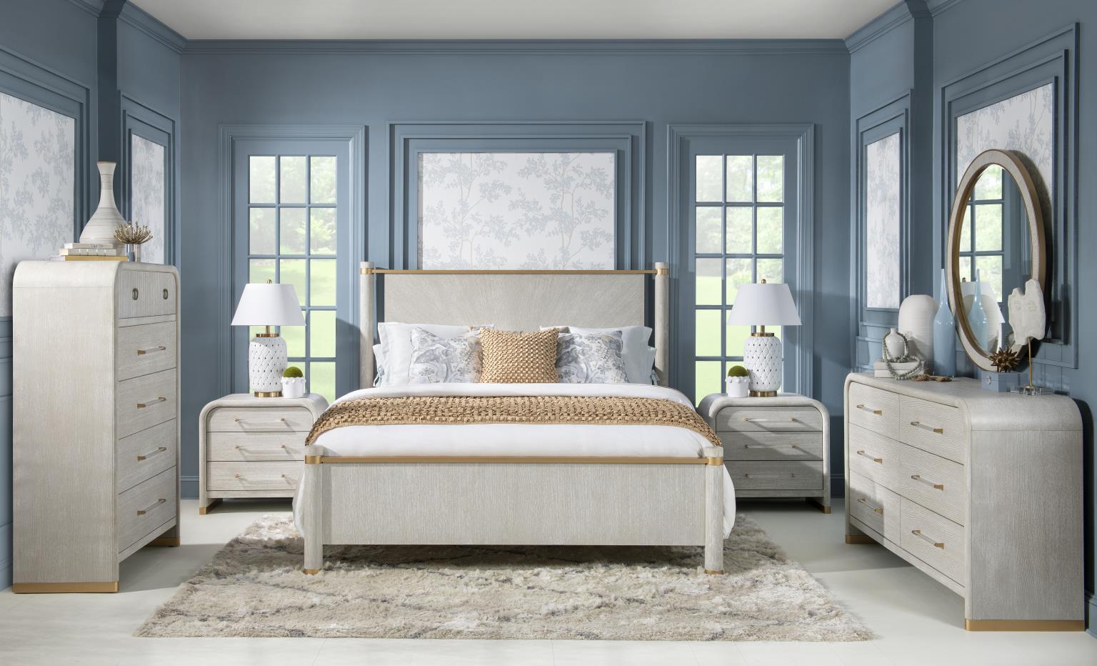 Approachable glamour. That's the look of the Miramar Total Home Collection from Legacy Classic - Modern. The collection features and acrylic accents bold fluting detail and waterfall edges. The accent finish is used in banding on case bases and foot rails table bases and on the posters of the Canopy Bed and low-post bed.