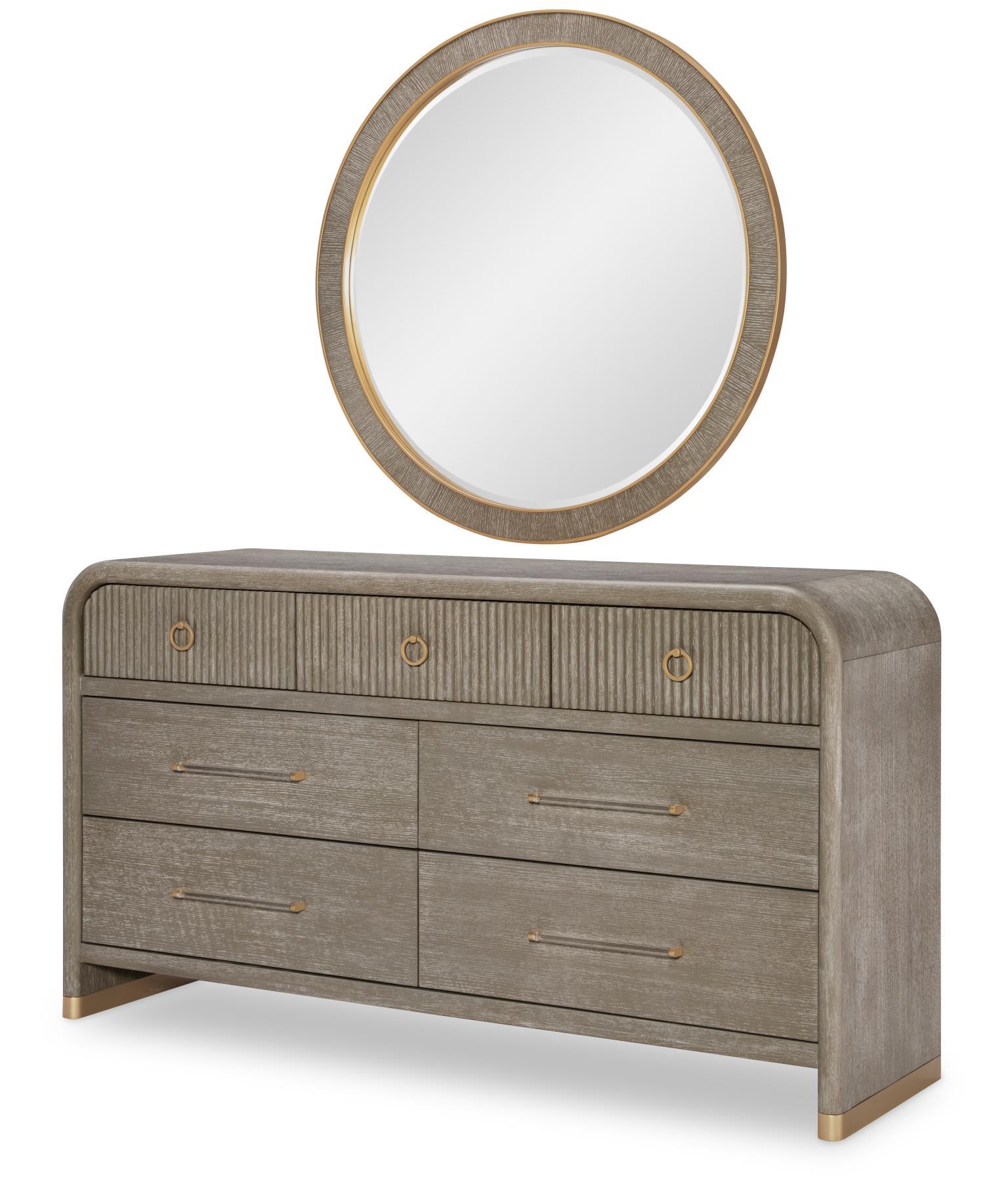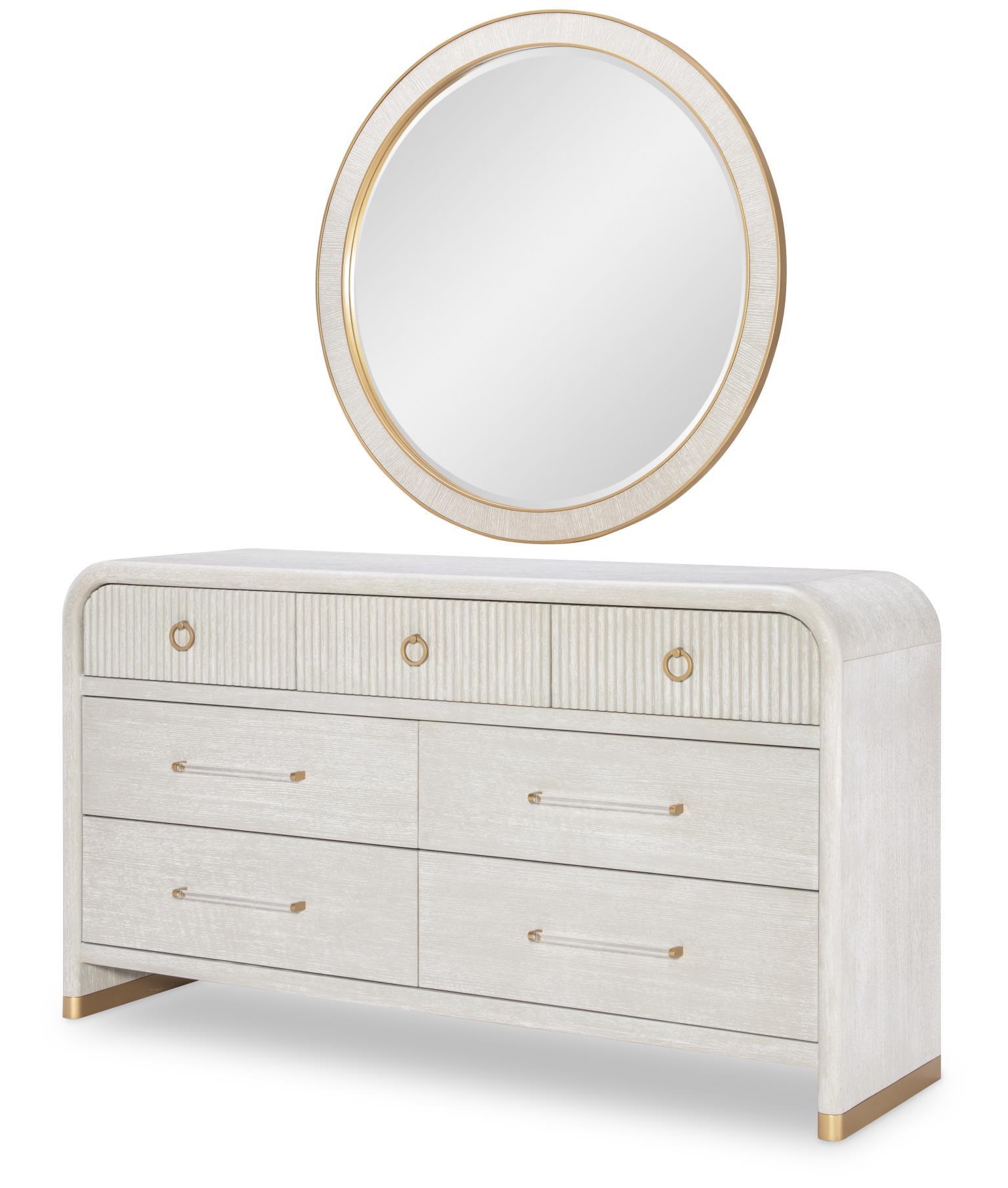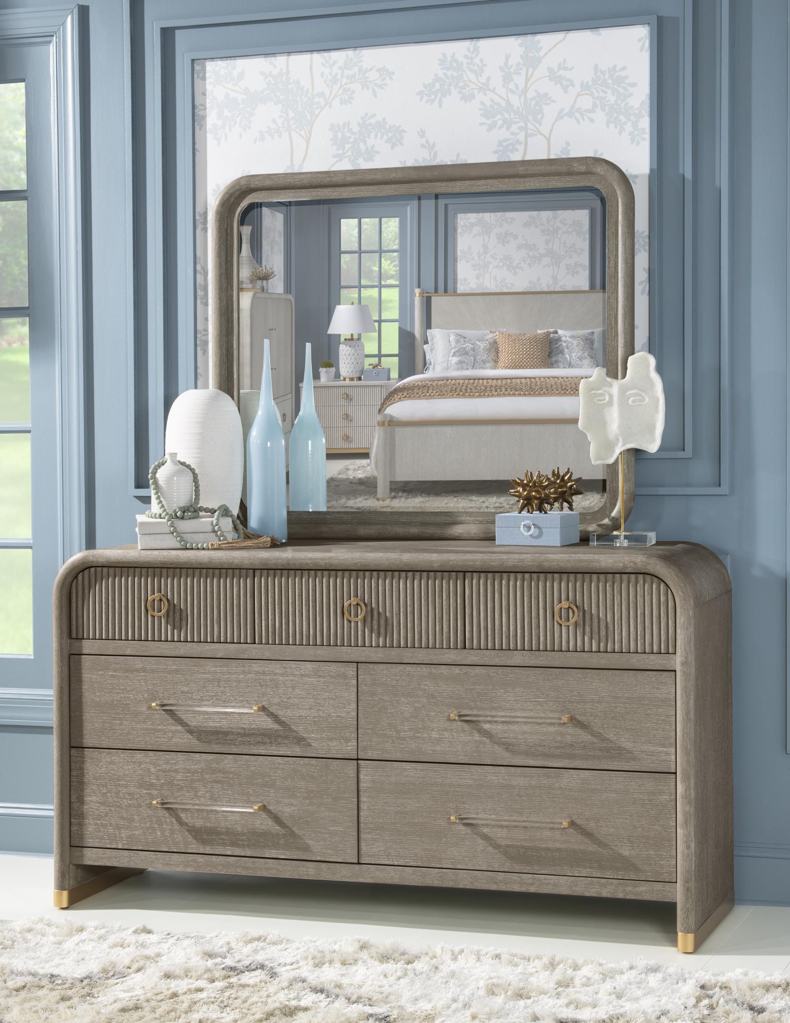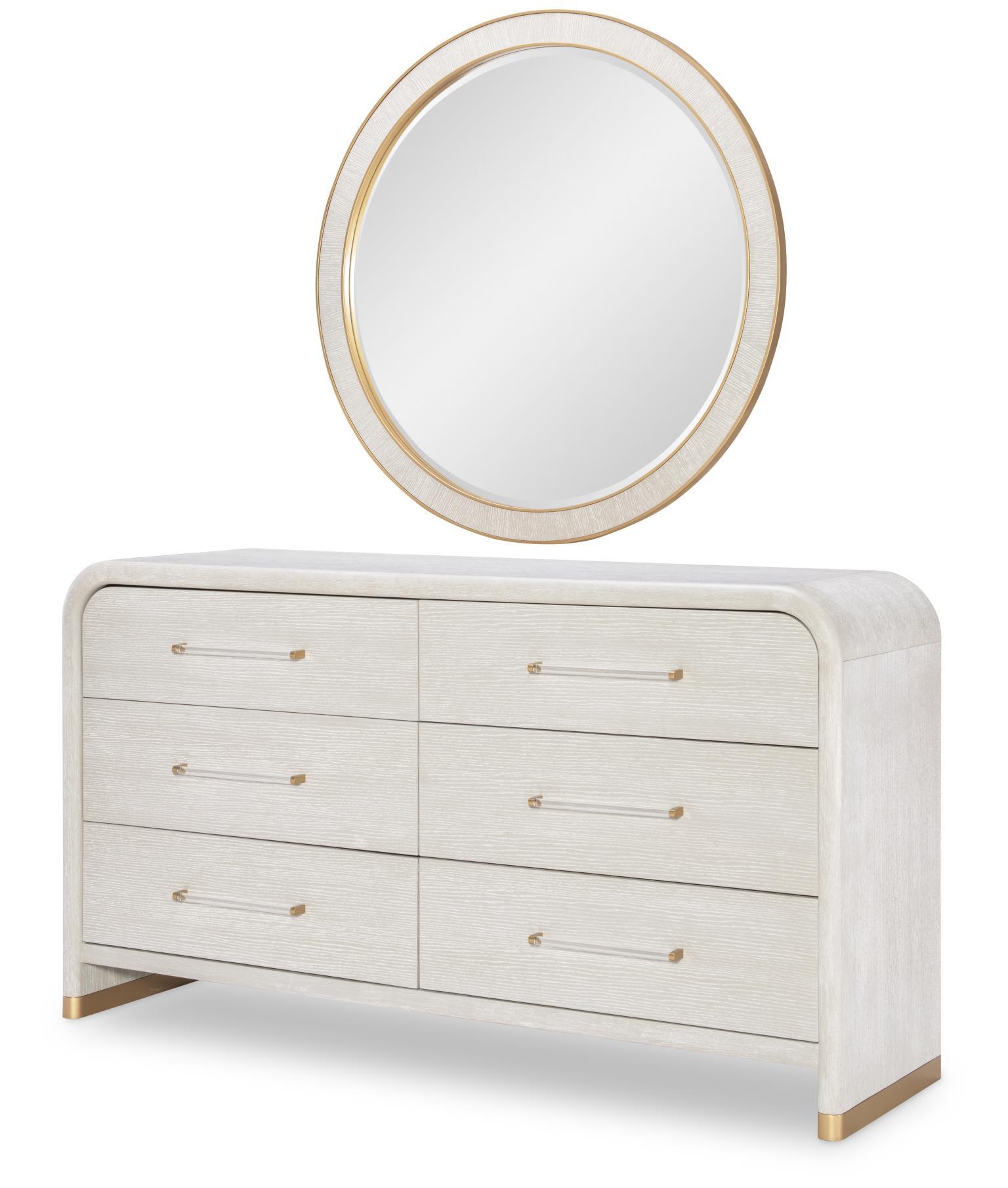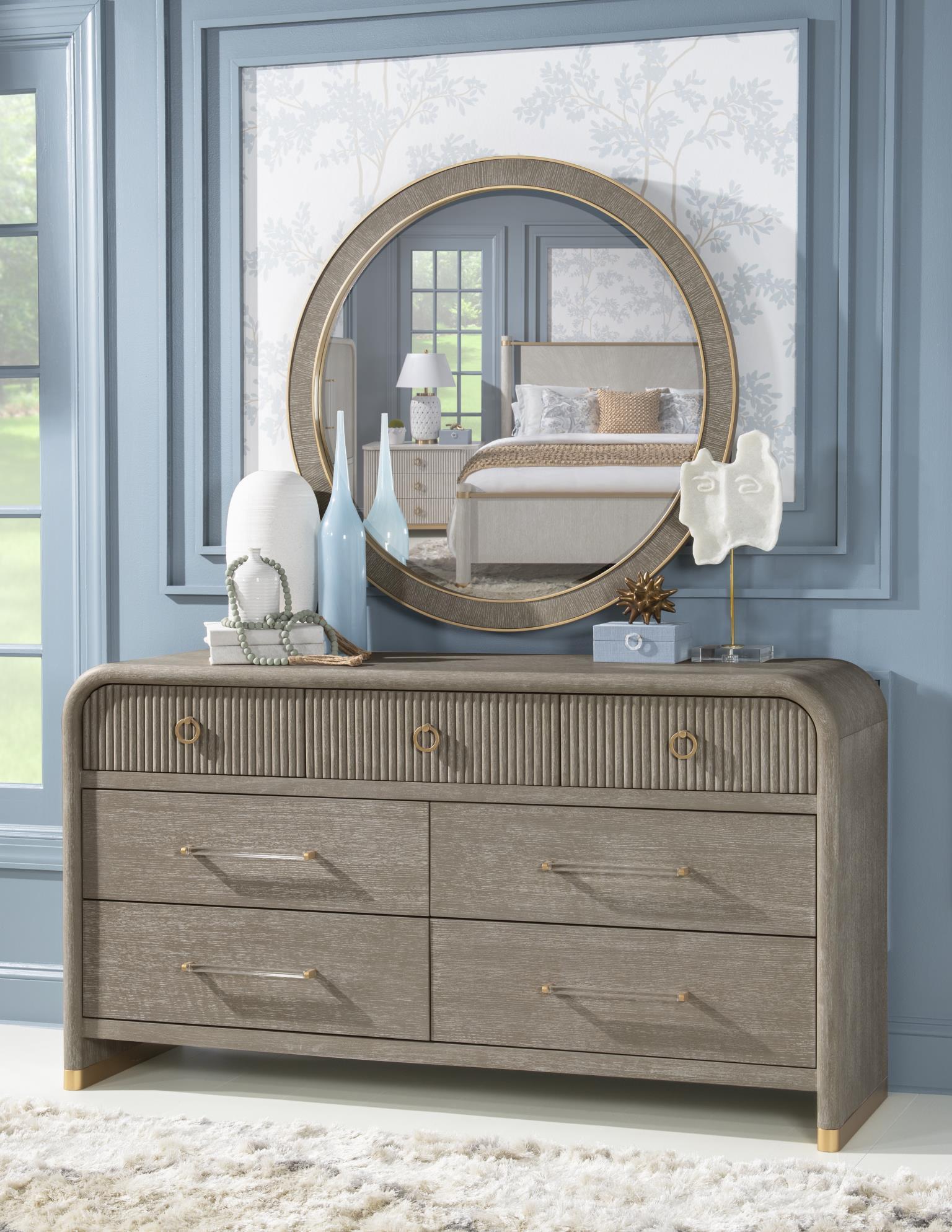 Approachable glamour. That's the look of the Miramar Total Home Collection from Legacy Classic - Modern. The collection features and acrylic accents bold fluting detail and waterfall edges. The accent finish is used in banding on case bases and foot rails table bases and on the posters of the Canopy Bed and low-post bed.