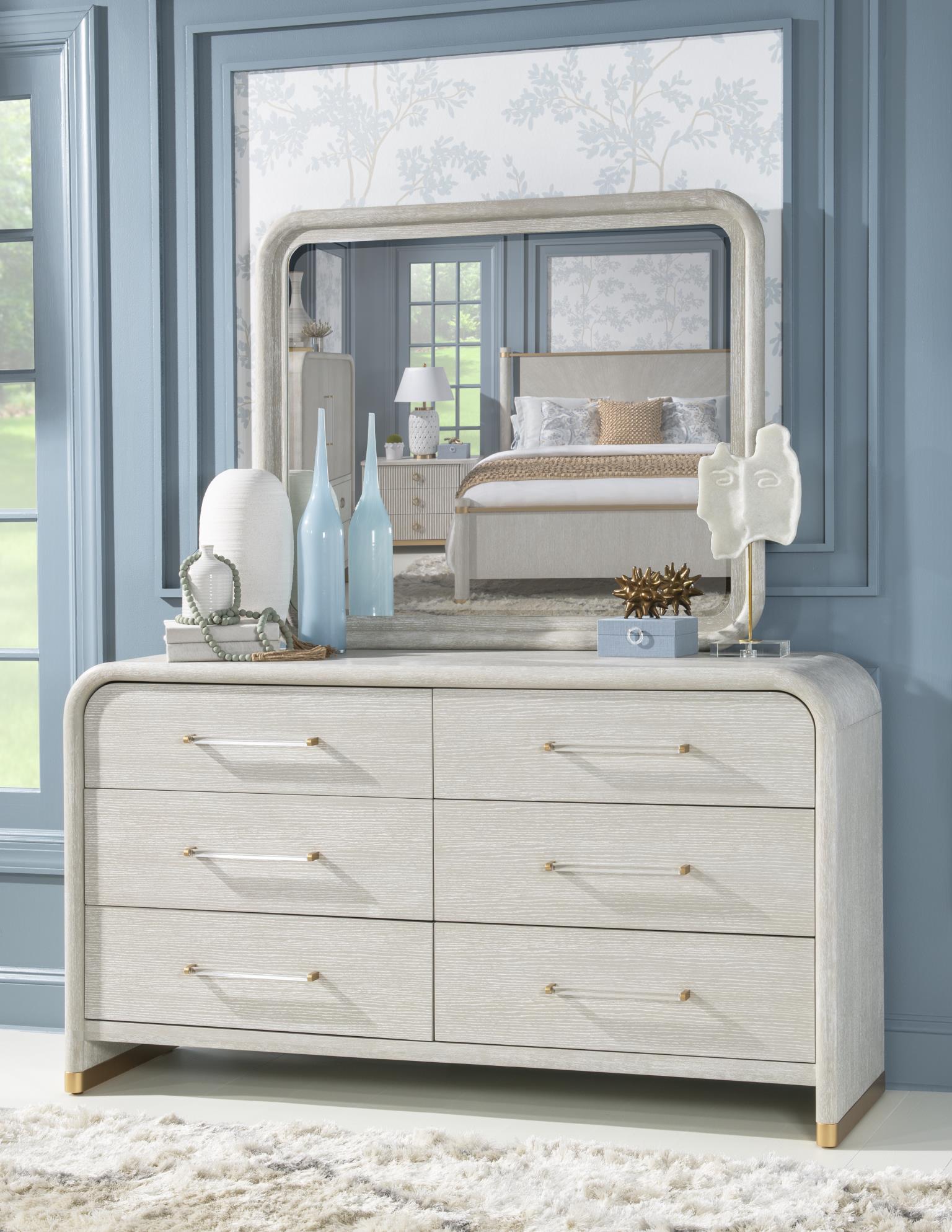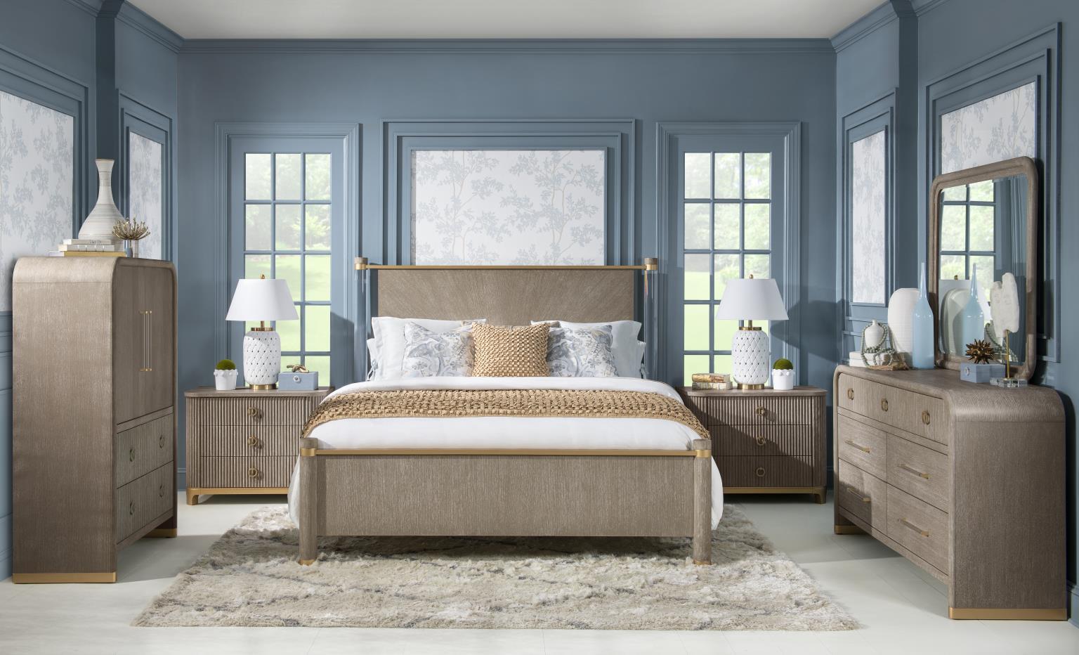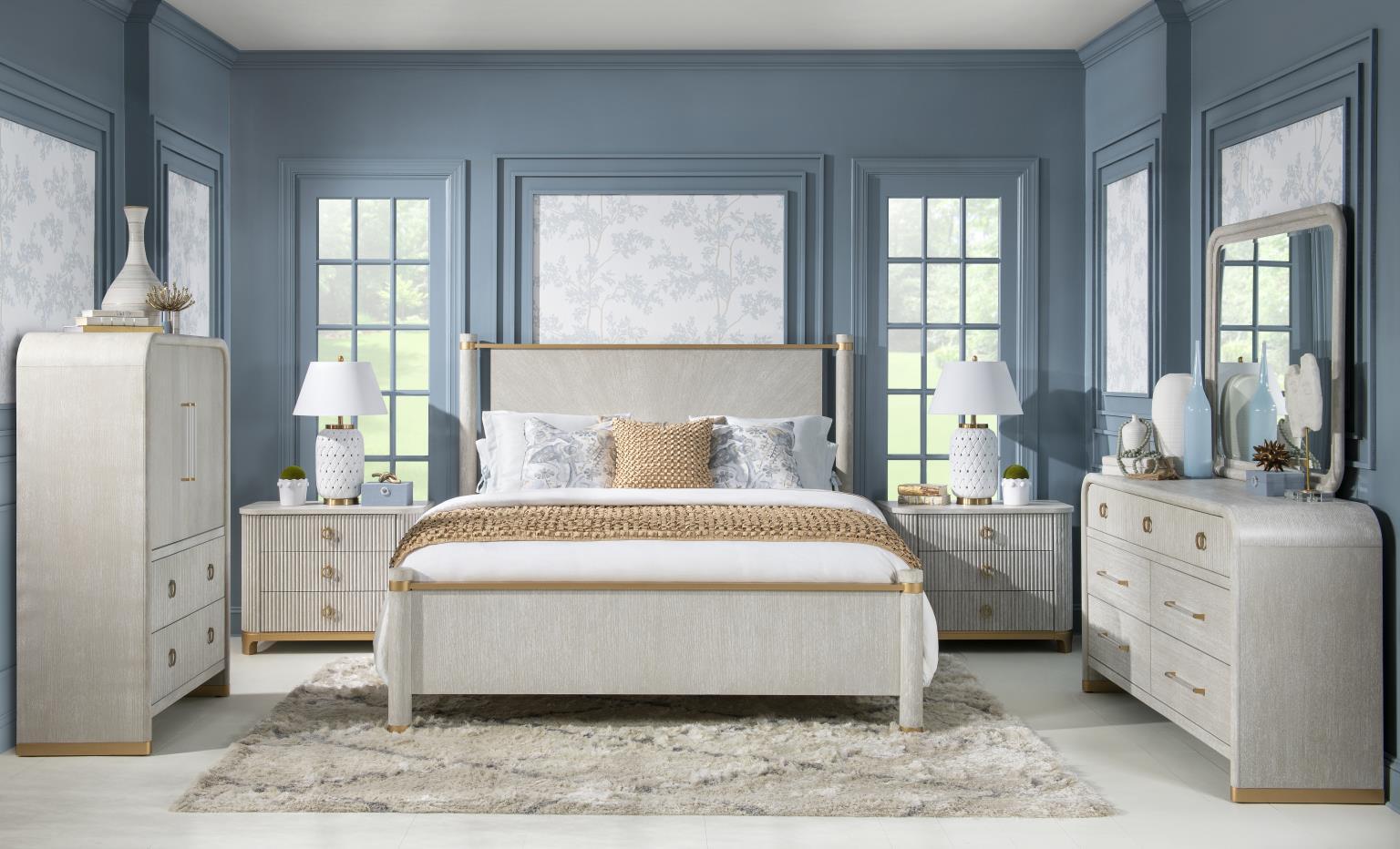 Approachable glamour. That's the look of the Miramar Total Home Collection from Legacy Classic - Modern. The collection features and acrylic accents bold fluting detail and waterfall edges. The accent finish is used in banding on case bases and foot rails table bases and on the posters of the Canopy Bed and low-post bed.