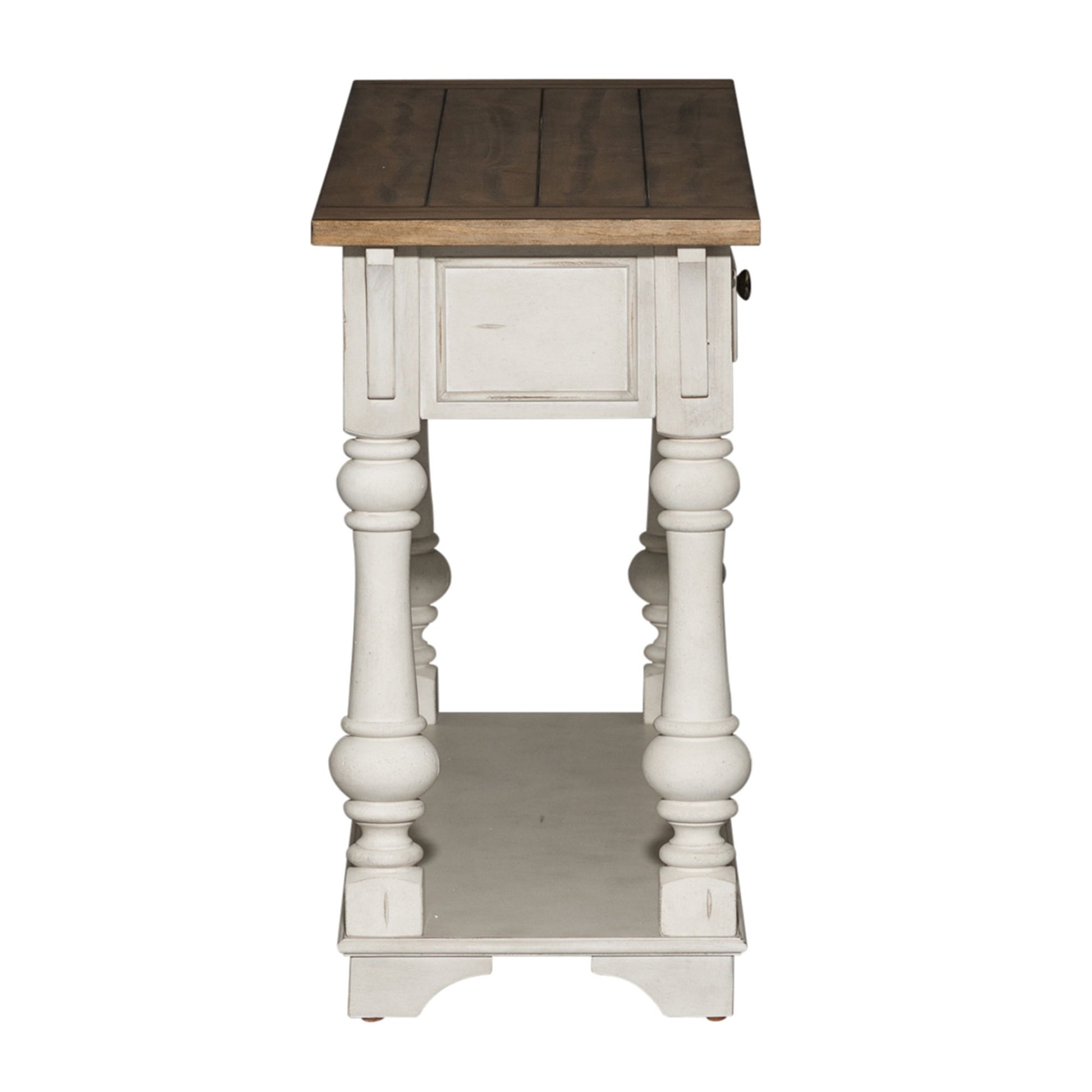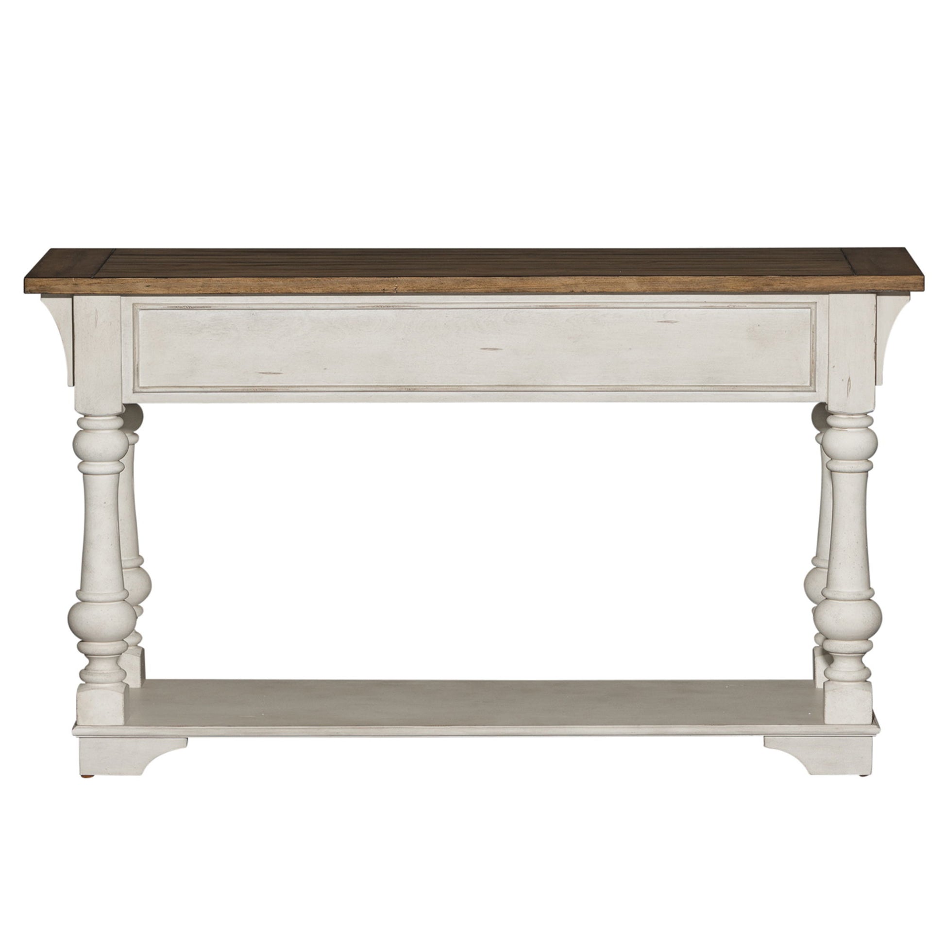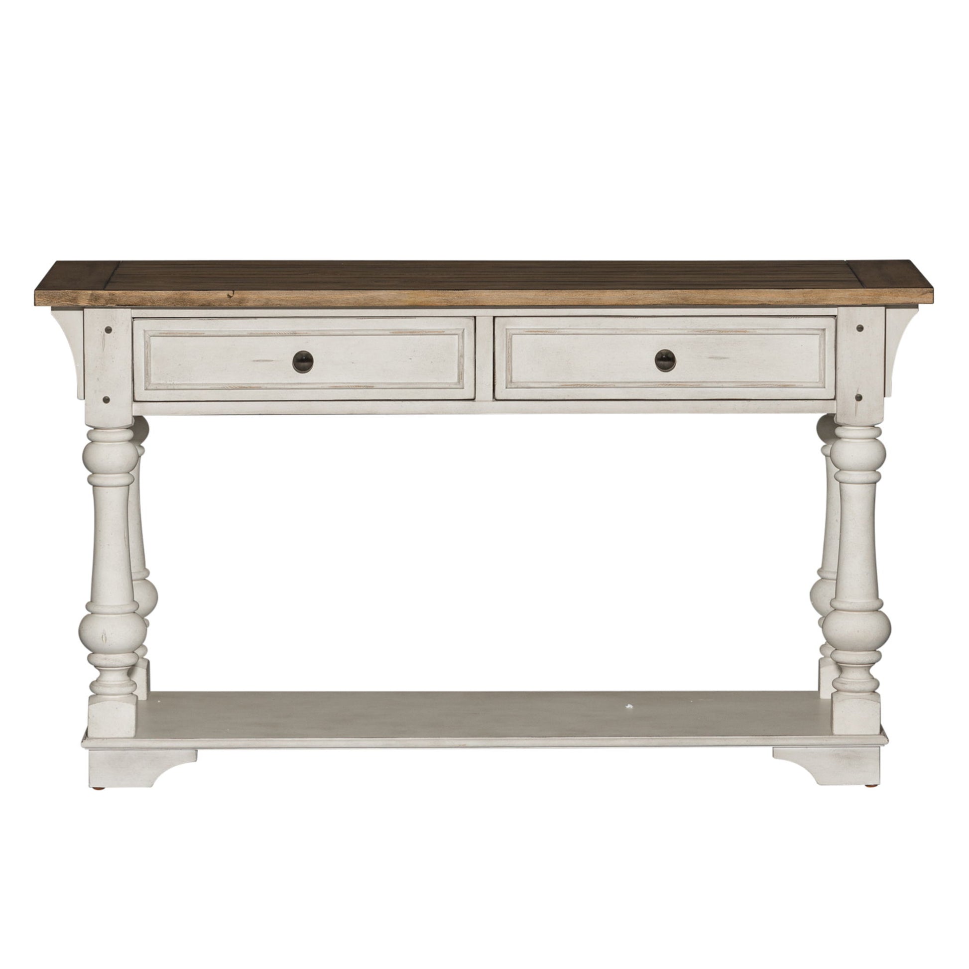 Elevate your space with the Morgan Creek sofa table. Crafted of poplar solids with pine and birch veneers, this piece features an antique white finish with spatter and watermark accents and a wire brushed tobacco planked top, appealing pewter nail head corner accents, and two full extension drawers with a bottom shelf for additional storage, anchored by round turned legs flowing into bracket feet. This gorgeous sofa table will bring a luxurious feel to any traditional space.