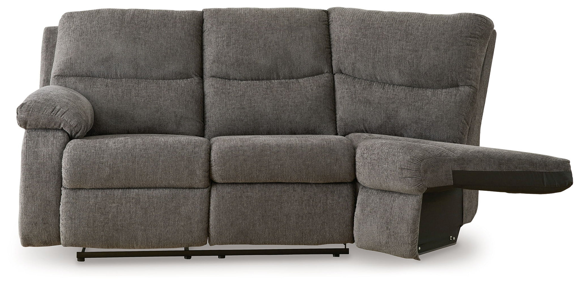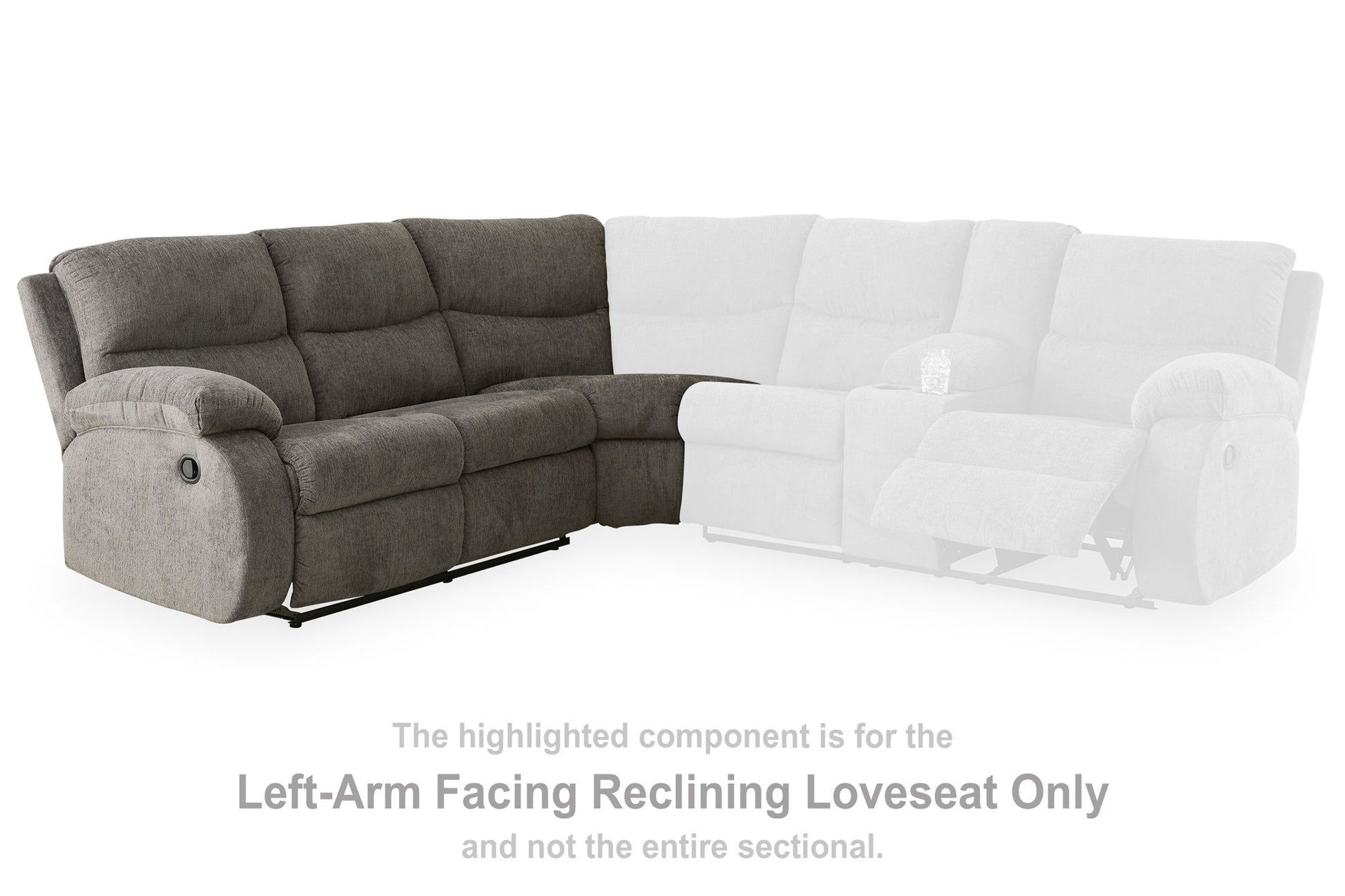 This left-arm facing reclining loveseat with half wedge is made with polyester upholstery. Pairs with other items in the series to make a sectional.