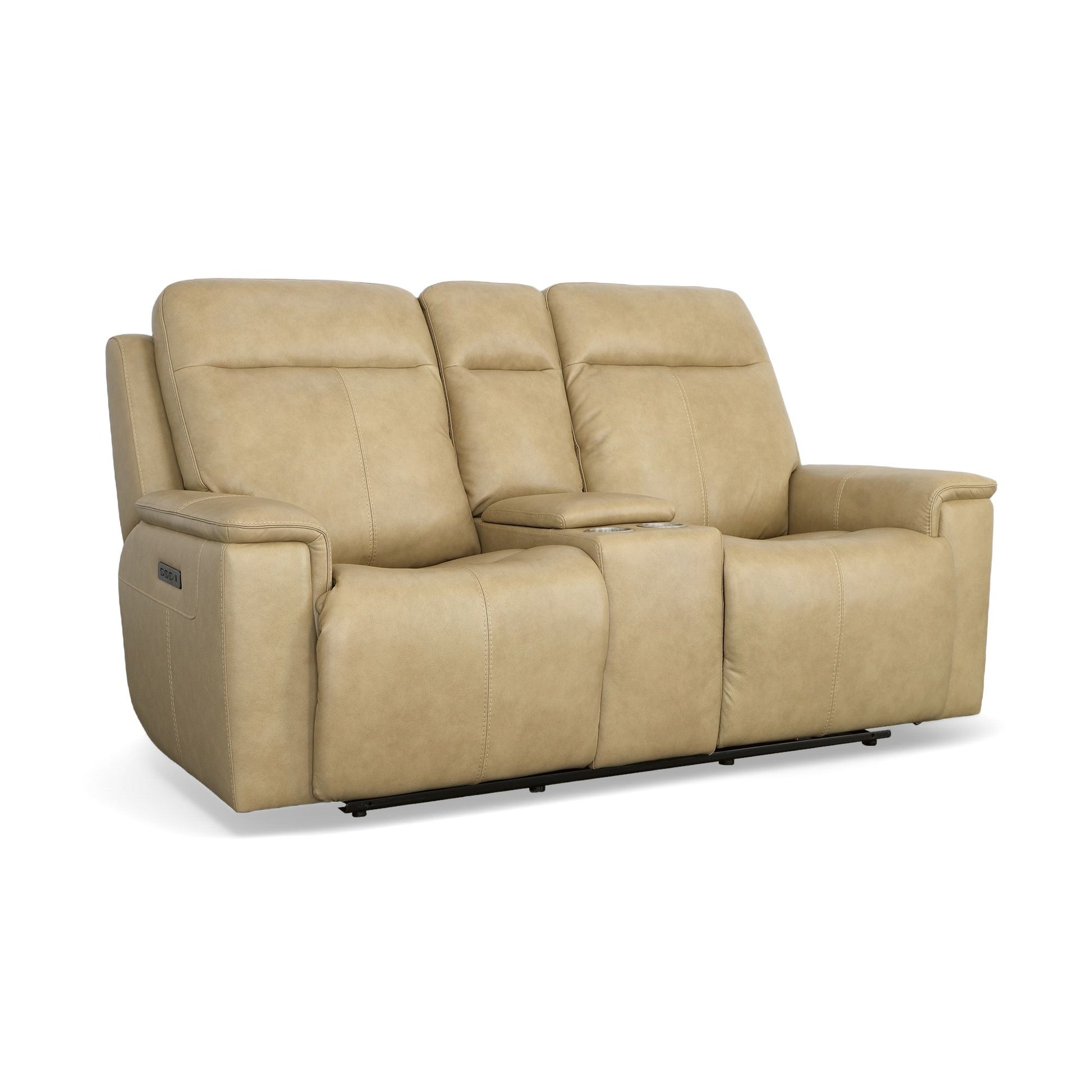 Ergonomic support meets elevated aesthetics with the Odell leather power reclining loveseat with console. Featuring clean lines, thin pad-over arms and high divided backs, this loveseat’s modern silhouette serves as an attractive complement to any living space. Triple power functionality allows for independent adjustment of both headrests, lumbar supports and recline for customized relaxation, while Zero Gravity technology provides a feeling of weightlessness and reduces pressure on the body. Use the convenient built-in USB ports to easily charge your mobile devices and the storage console to keep beverages and remotes within easy reach. With Flexsteel's patented Blue Steel Spring™ at the heart of each seat, and high-quality, light tan, top-grain leather, the Odell power reclining loveseat brings refined beauty and durability to your home.