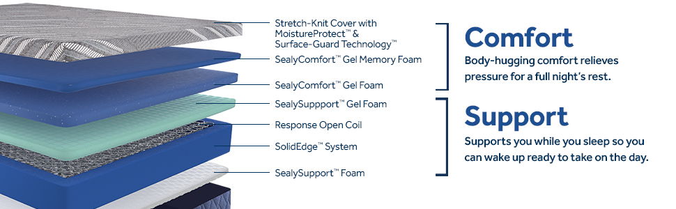 This 12" medium hybrid mattress features the cushioning, cooling conformance of our SealyComfort™ Gel Memory Foam with added layers of our SealyComfort™ Gel Foam for increased support. The mattress features the all-over support of an open coil system with a reinforced edge and a moisture-wicking, antibacterial cover that helps keep the mattress protected.