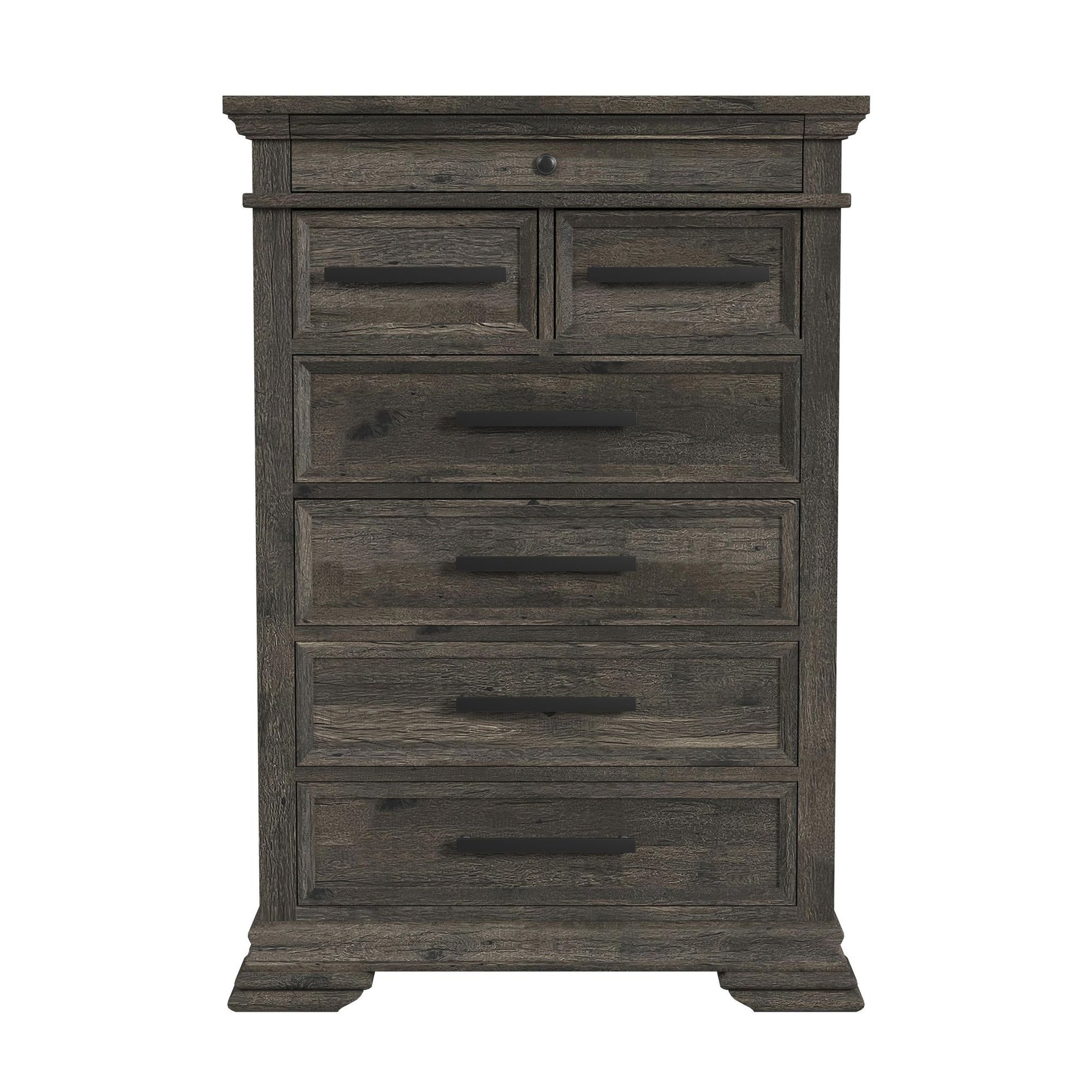 The Park Ridge 6-Drawer Chest seamlessly blends style and functionality in a warm and inviting manner.. Sturdy metal hardware adorns each drawer, while the top drawer specifically is fitted with black felt lining as an added layer of protection to the drawer and its contents alike. With its classic farmhouse design elements and practical nature, the Park Ridge 6-Drawer Chest is a perfect addition to any bedroom.