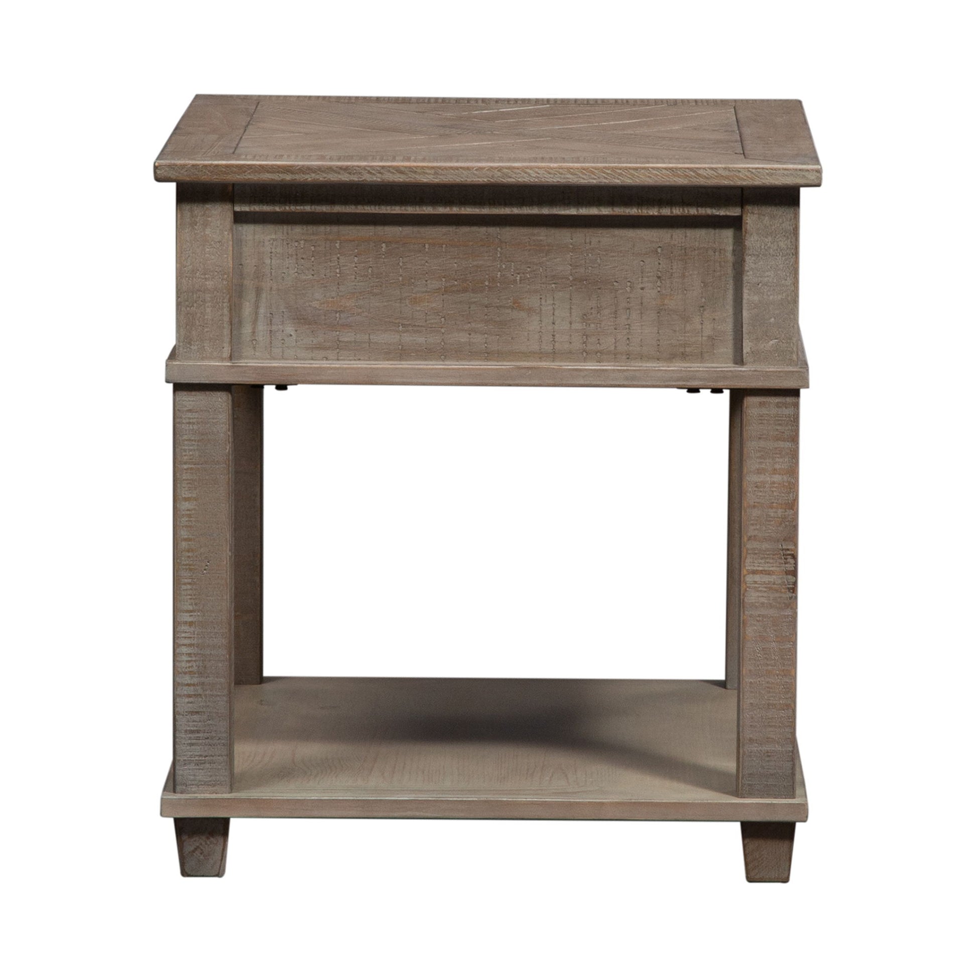 Accent your space with the casual Parkland Falls rectangular end table. Crafted of pine solids and knotty pine veneers, this piece features a weathered taupe finish with saw mark distressing, an appealing planked top, one full extension drawer with a wood framed drawer front, a bottom shelf for storage, and appealing pewter bar pull hardware. This piece is a great addition to any rustic, contemporary, or casual living space.
