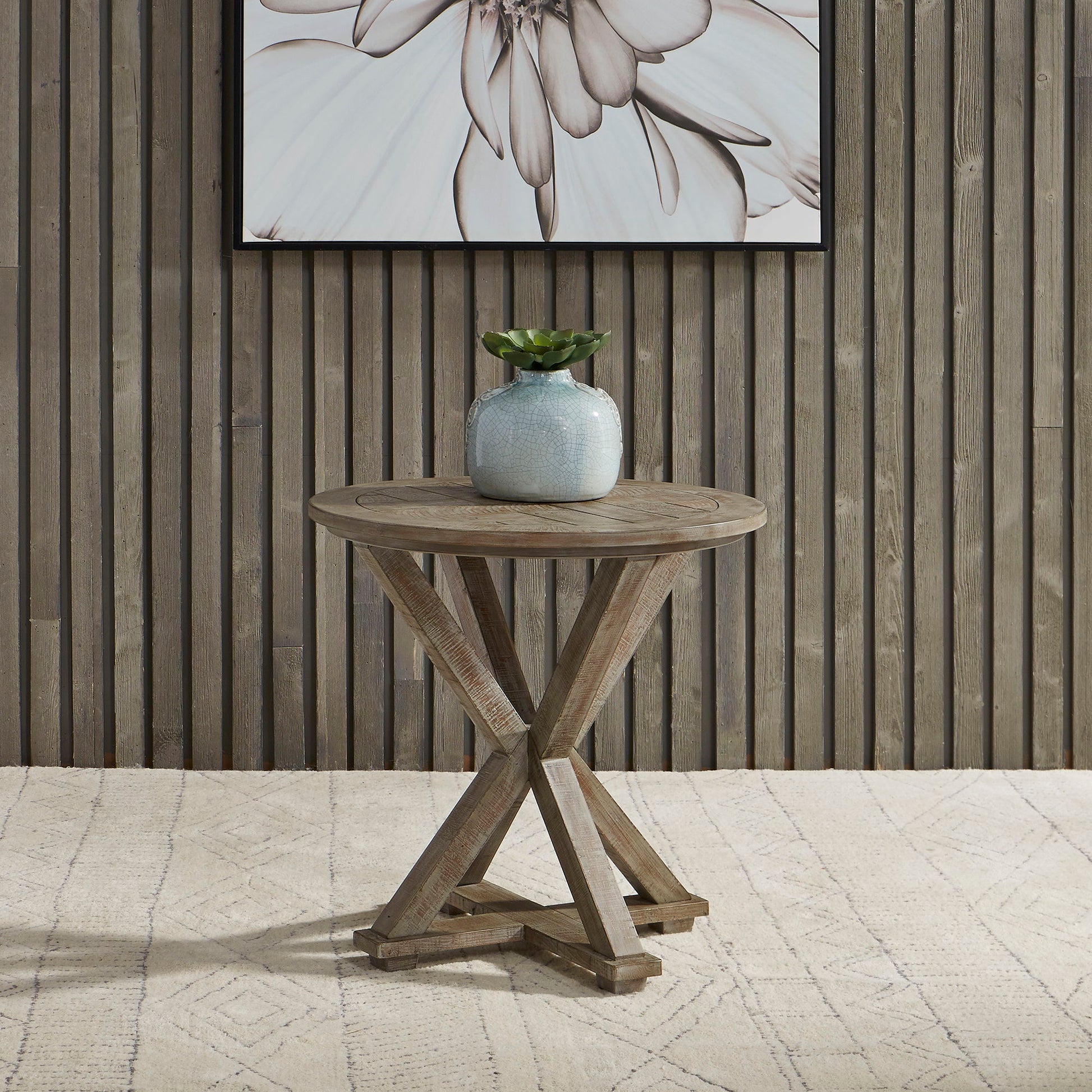 Elevate your space with the contemporary Parkland Falls round end table. Crafted of pine solids and knotty pine veneers, this piece features a weathered taupe finish with saw mark distressing, appealing planked top, anchored by a unique pedestal base. This piece is a great addition to any rustic, contemporary, or casual living space.