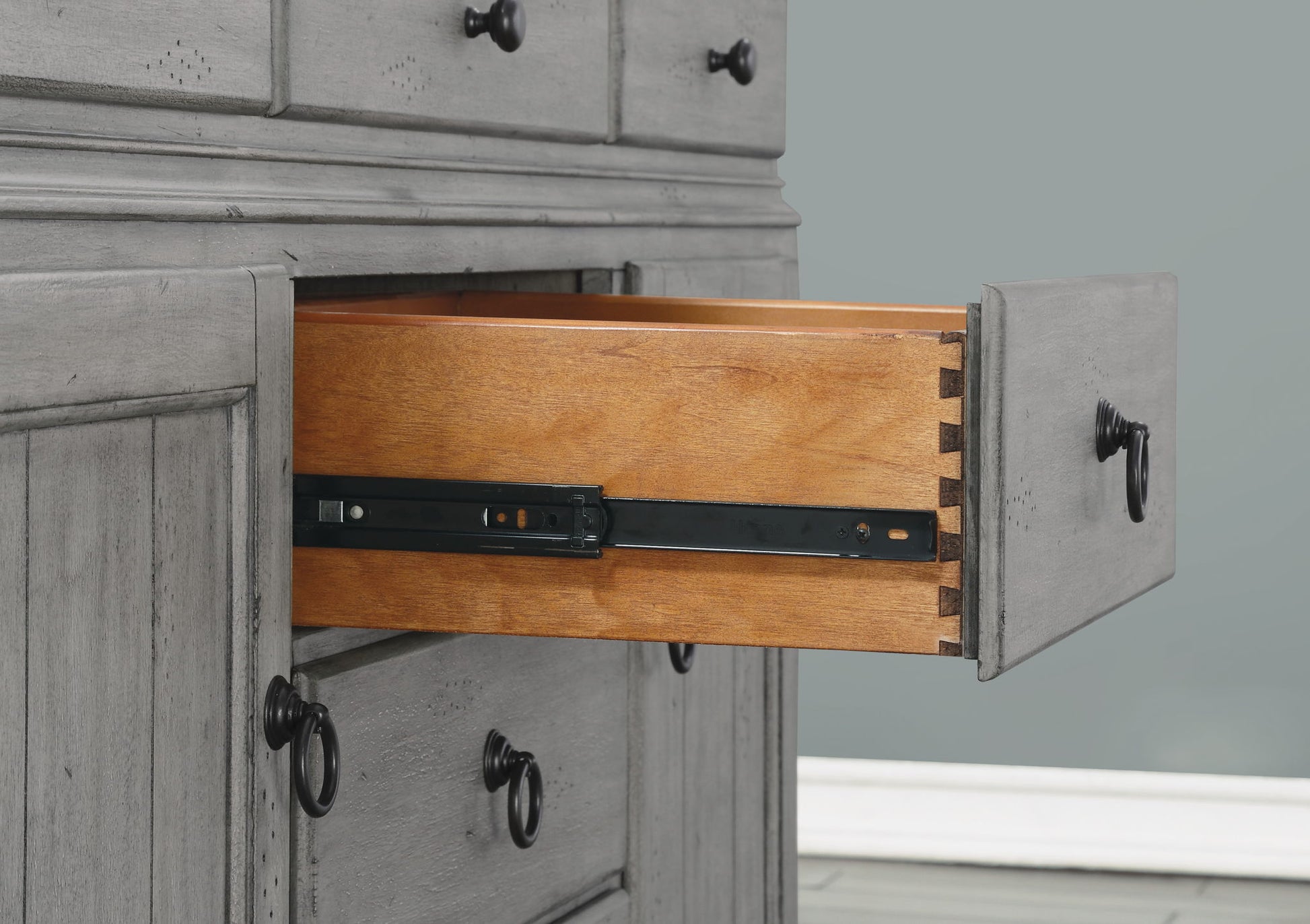 Entertain in relaxed cottage style with everything you need to host dinner guests with this Plymouth buffet. A weathered graywash finish is accented by a medium brown top and gunmetal pulls, while paneled details and turned bun feet add to the cozy vintage character. This buffet features two cabinet spaces with adjustable shelves and a removable wine rack that can store up to 16 bottles. Pair that with six spacious drawers—complete with felt-lined top drawers and a removable silverware tray—and you have ample storage for serving pieces and other dining essentials. Each drawer features ball-bearing glides for smooth access and support for heavy dining ware.