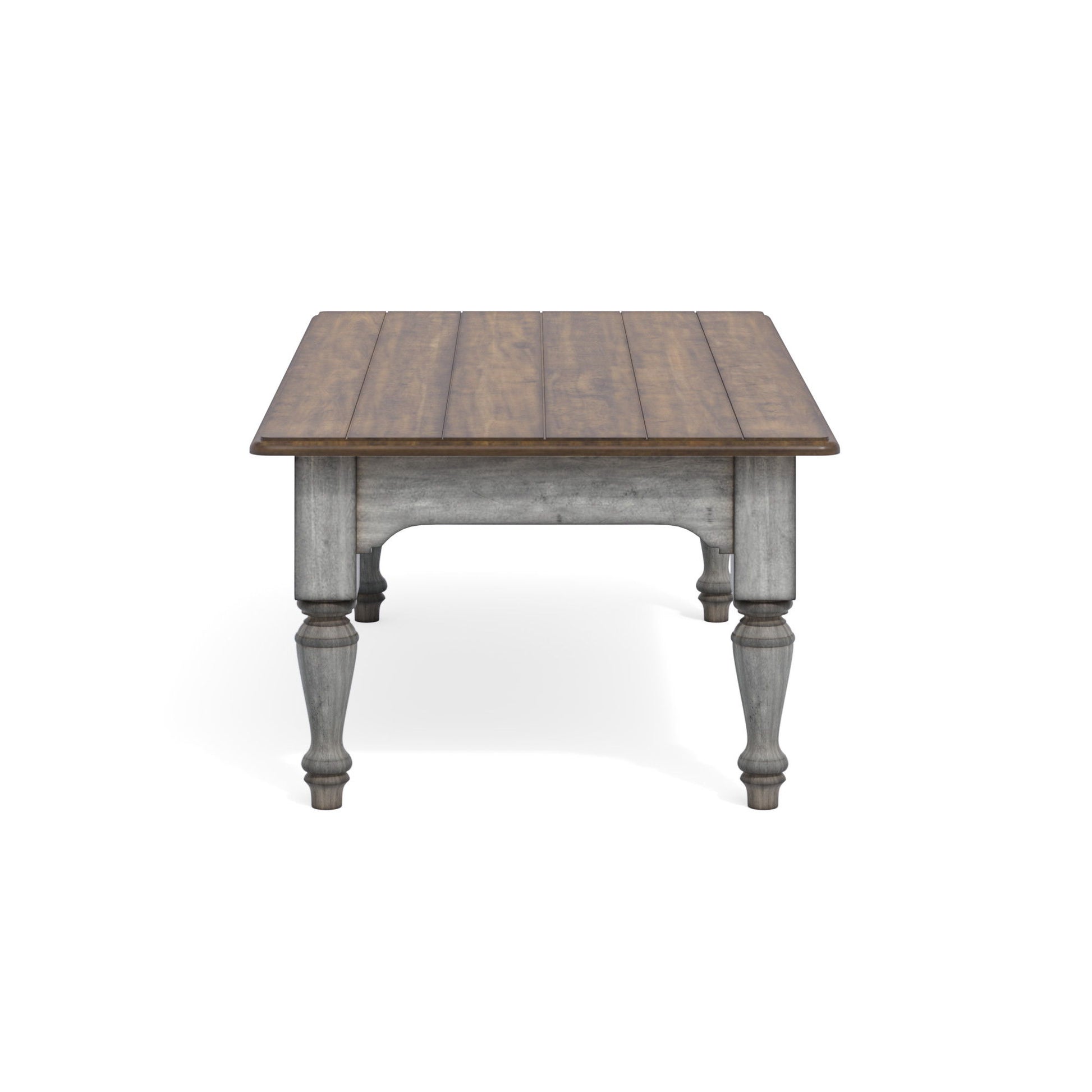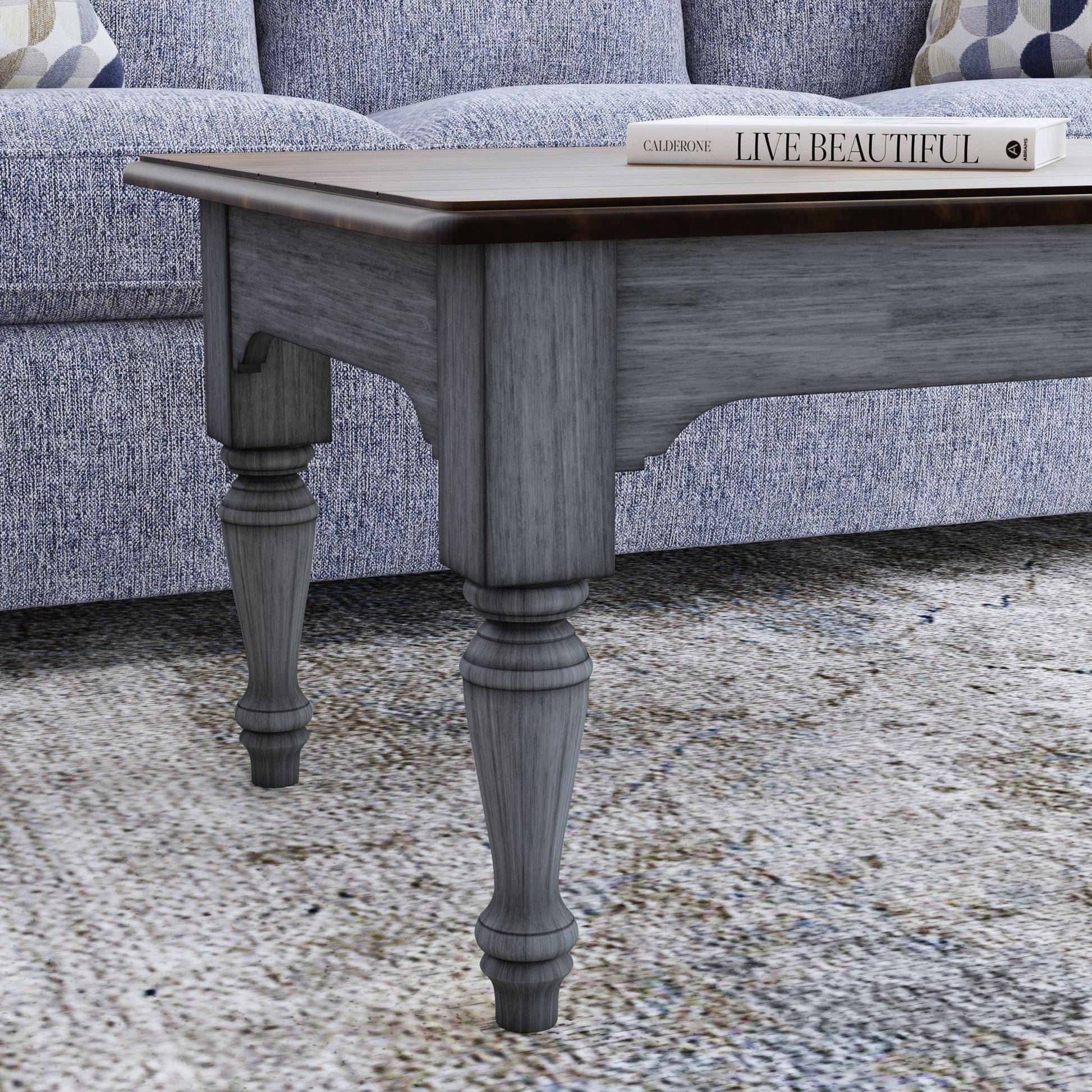 Transform your living room into a cozy cottage retreat with the Plymouth rectangular coffee table. A weathered graywash finish, medium brown planked top and turned legs create a charming vintage vibe, while the large tabletop provides ample area to place drinks and décor.