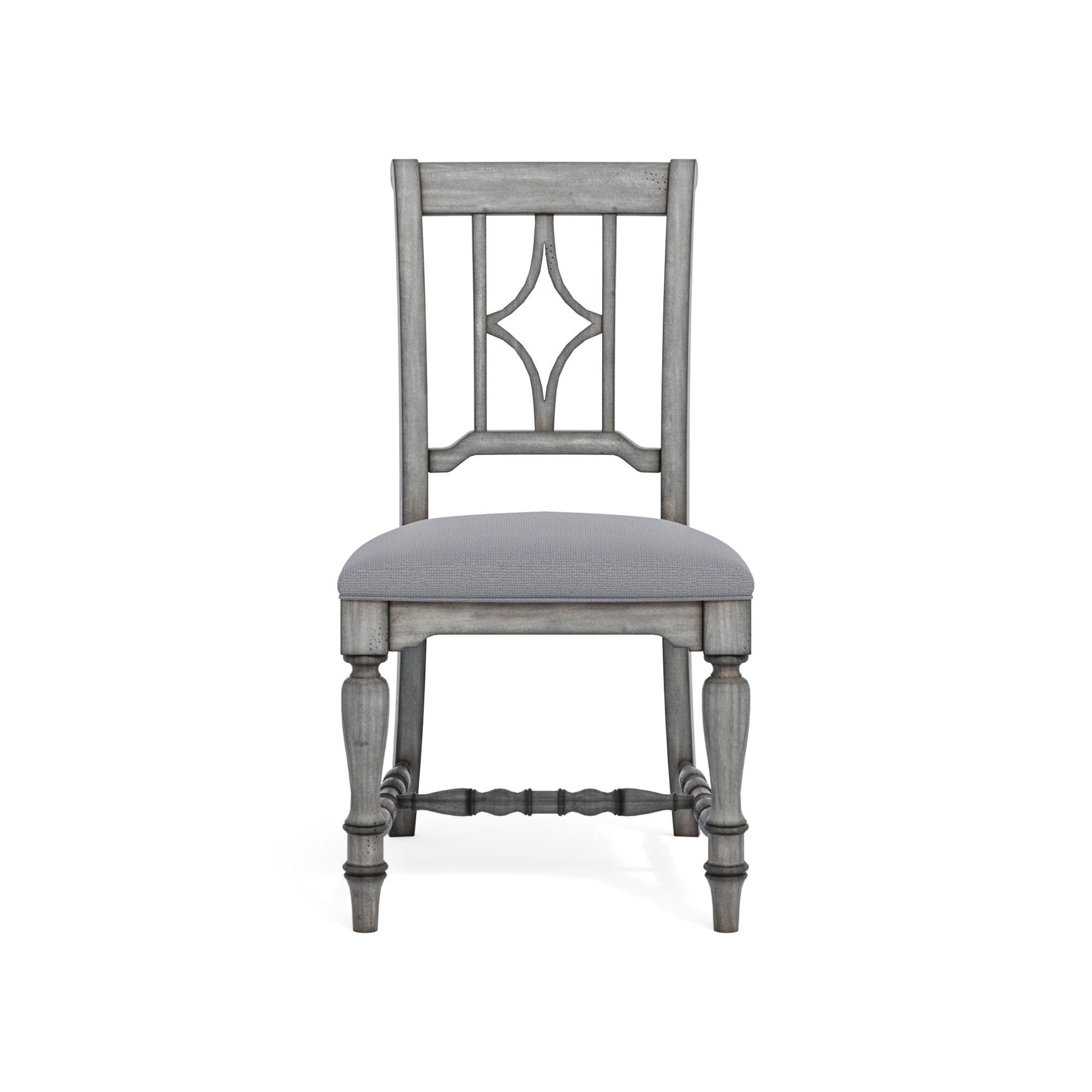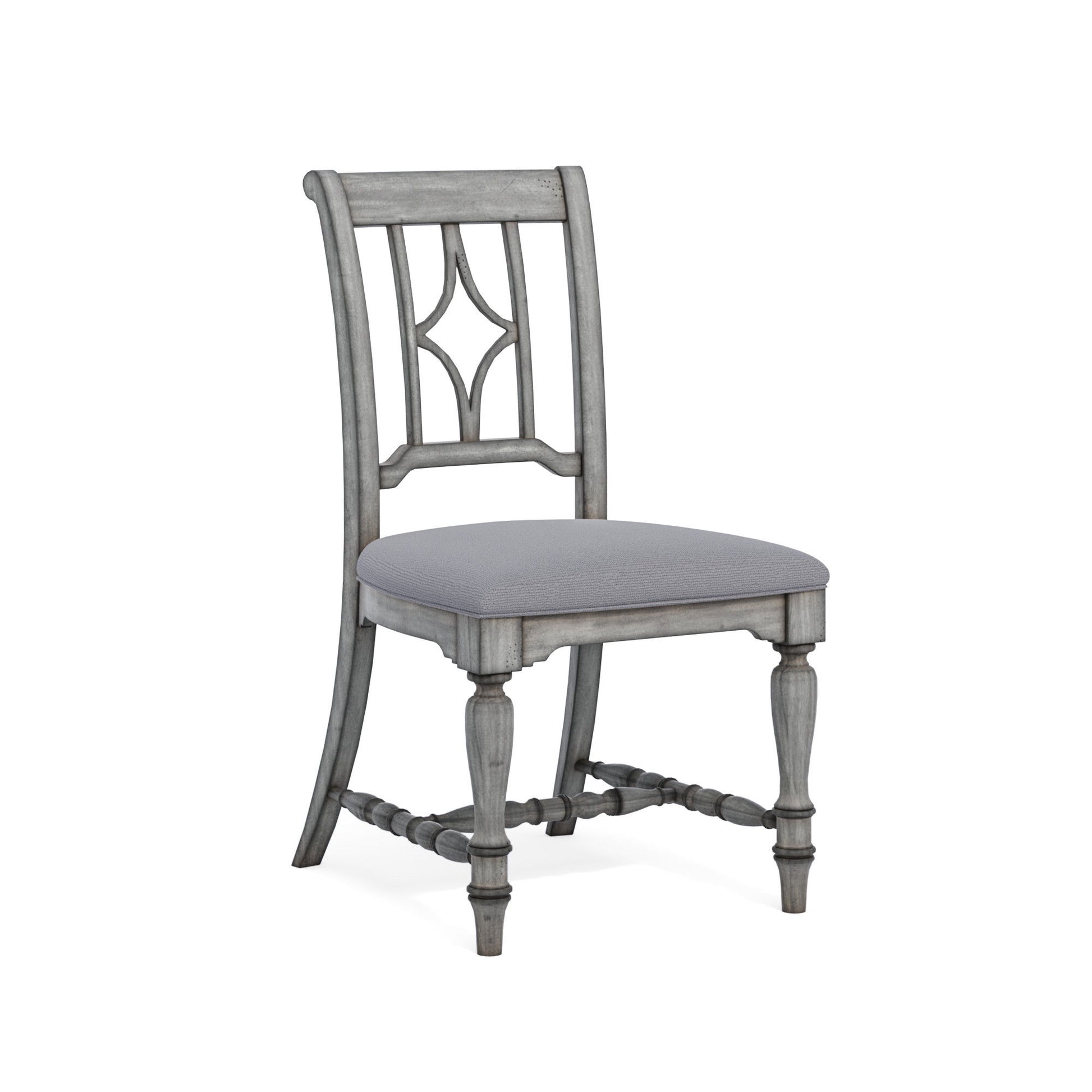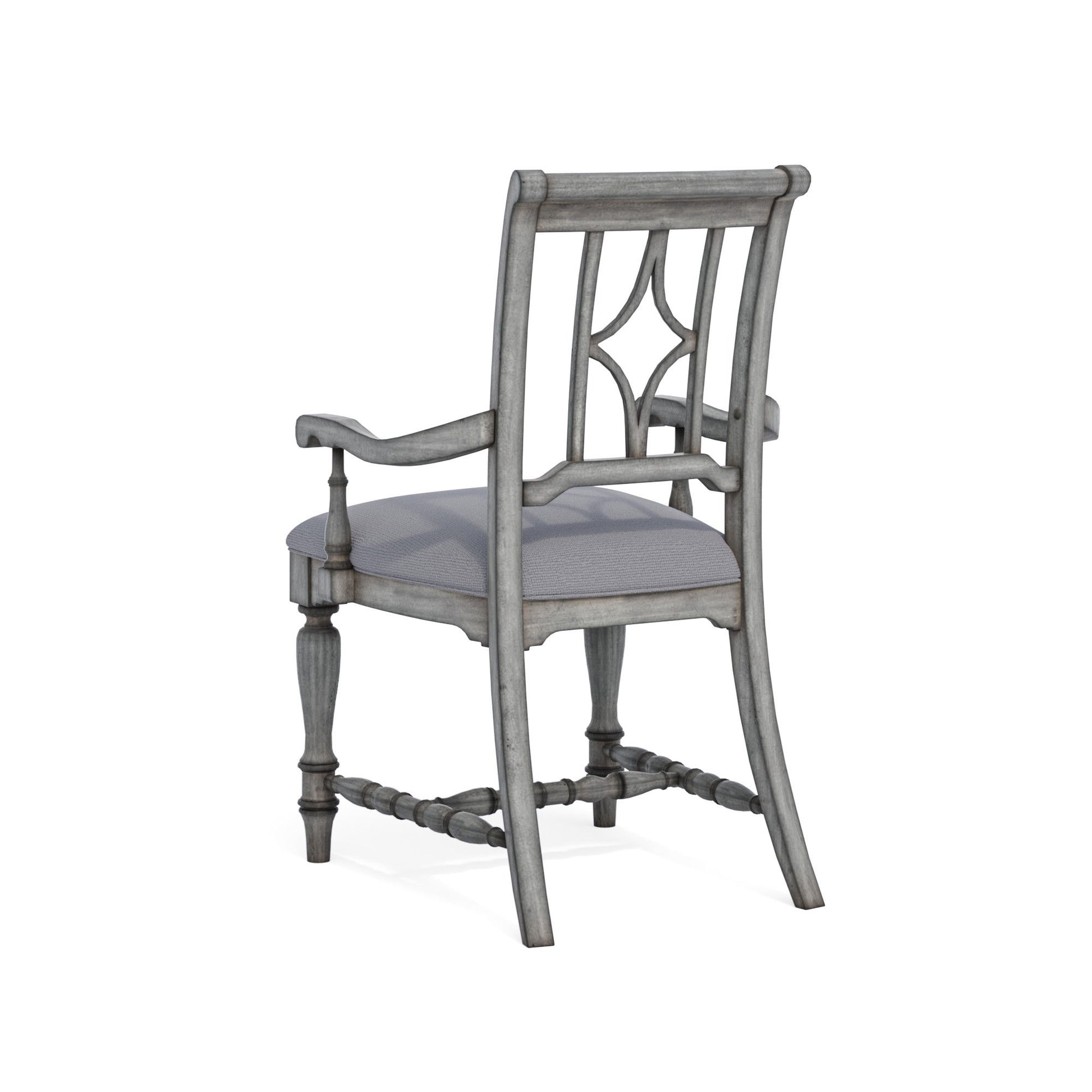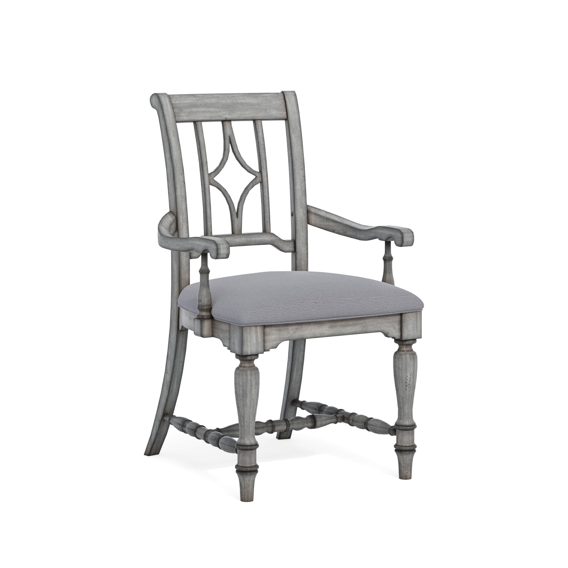 Shabby chic design with a bit of vintage. The Plymouth upholstered arm dining chair boasts a shabby chic design with an overall graywash finish. Accented by coordinating dark dining table and buffet tops, Plymouth is ideal for those who like a bit of vintage design in their modern lives. This chair features a panel back with a diamond-shaped detail, and is a perfect seating choice to complement the Plymouth rectangular dining table or round pedestal dining table.