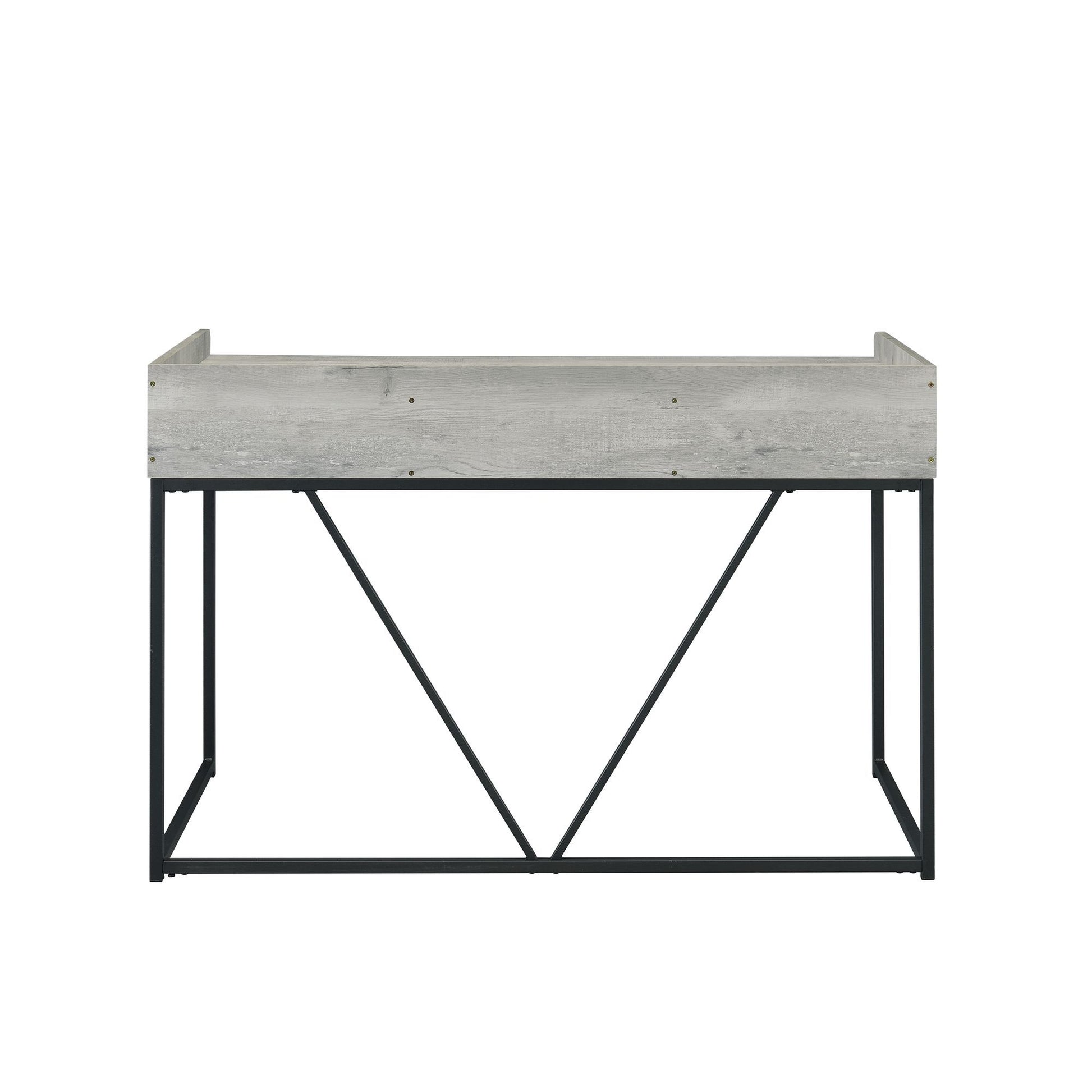 The Preston Desk provides plenty of functionality and style. With one spacious drawer and two open storage compartments, the Preston provides ample storage for storing your favorite books. Constructed of sturdy wood and metal with a V-shaped back design. Black metal secure drawer pull adds textural element to this industrial desk. Includes one power outlet for keeping all of your devices charged. Features woodgrain detailing for a rustic finish. The vintage, industrial design is perfect for your home office or living room.