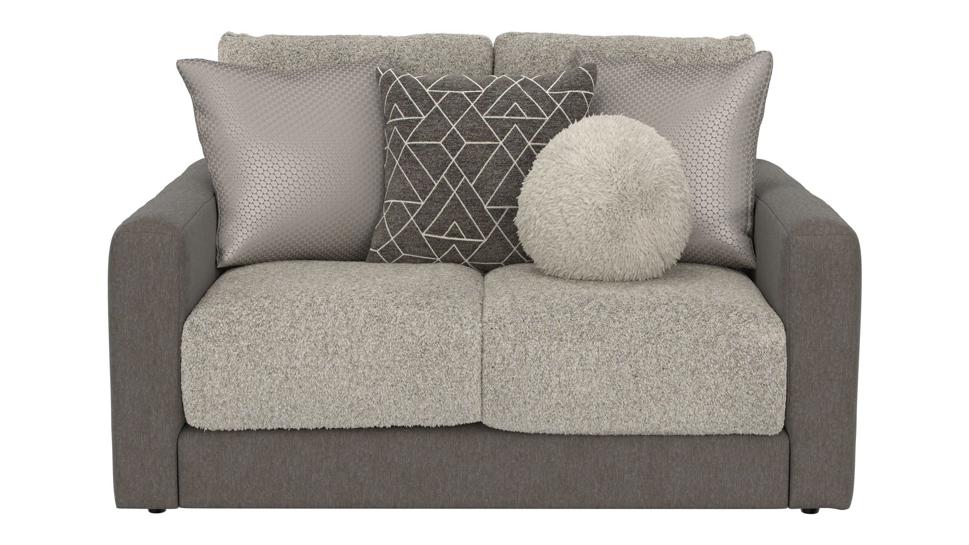 Reddington is a stationary sofa group that the ultimate comfort of our Cuddler Cushion. This dual-fabric application is accented with an ecelectic mix of toss pillows in a variety of textures - including sphere pillows in a luxurious faux fur. Reddington includes a convenient Cocktail Ottoman and is available in one color combination: Slate/Fawn.