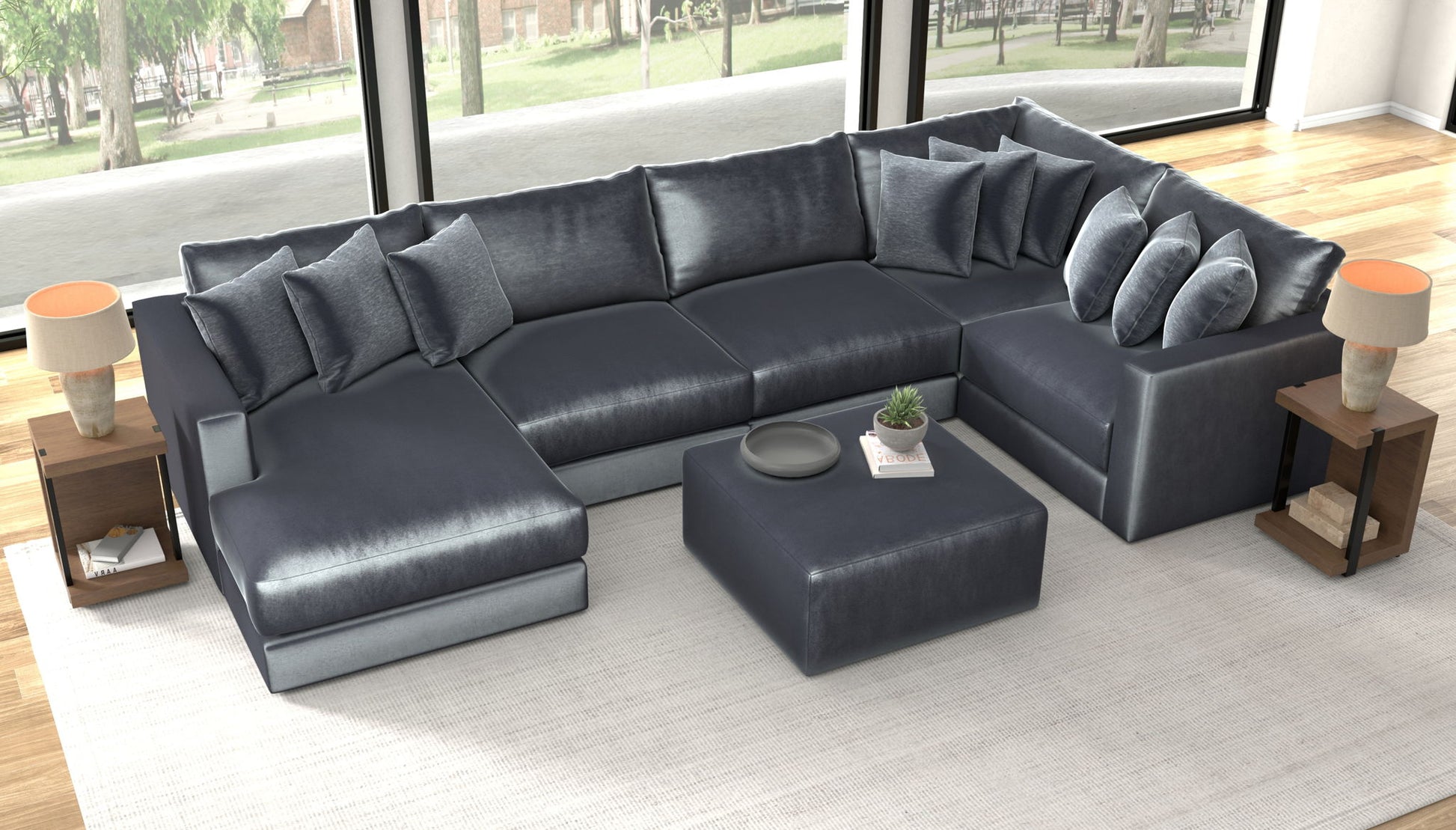 Remington is a track arm design Modular Sectional with loose backs and our Cuddler Cushion for ultimate comfort. Available in your choice of two luxurious velvet fabric colors: Pine or Slate.