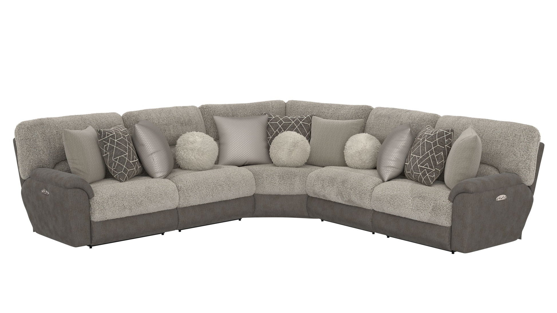 Rendezvous is a Reclining Modular Sectional that the ultimate comfort of our Power Headrest feature. This dual-fabric application is accented with an ecelectic mix of toss pillows in a variety of textures - including a sphere pillow in a luxurious faux fur. Rendezvous includes a convenient Castered Cocktail Ottoman and is available in one color combination: Slate/Fawn.