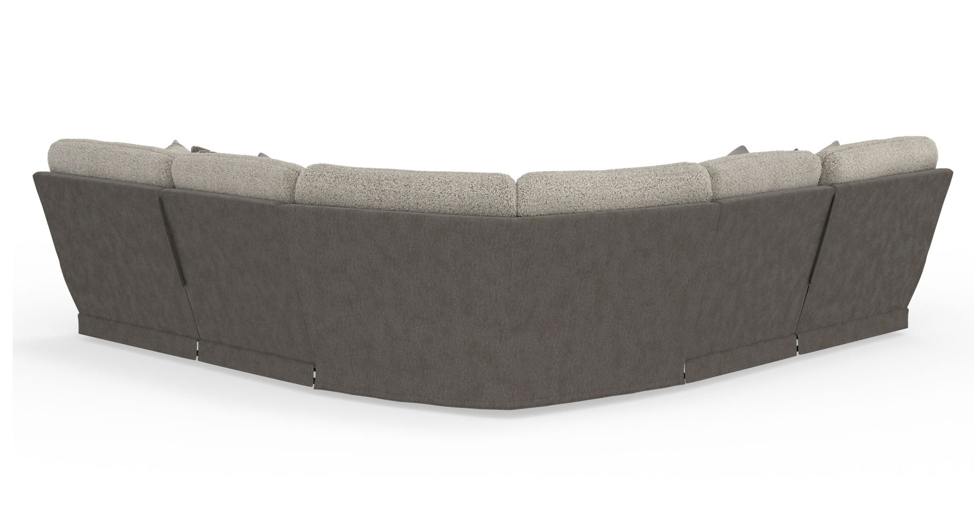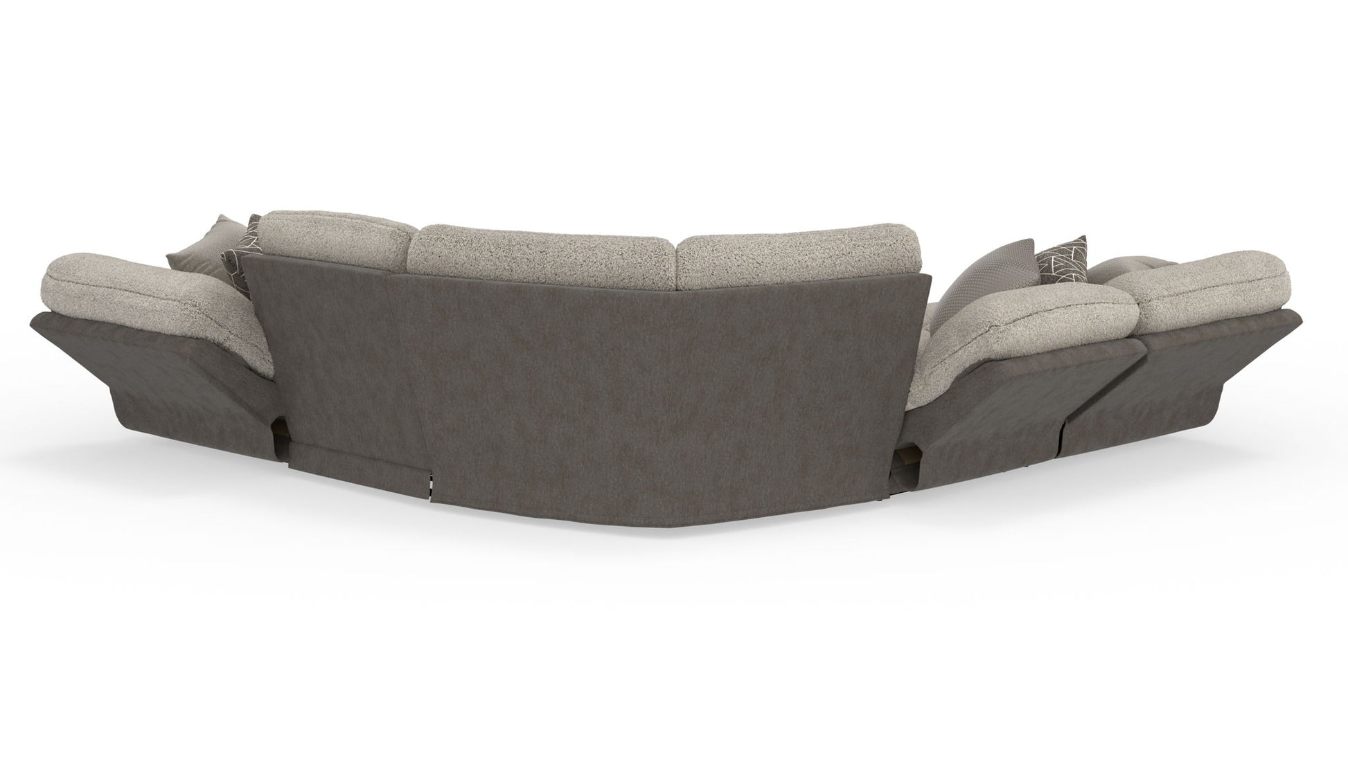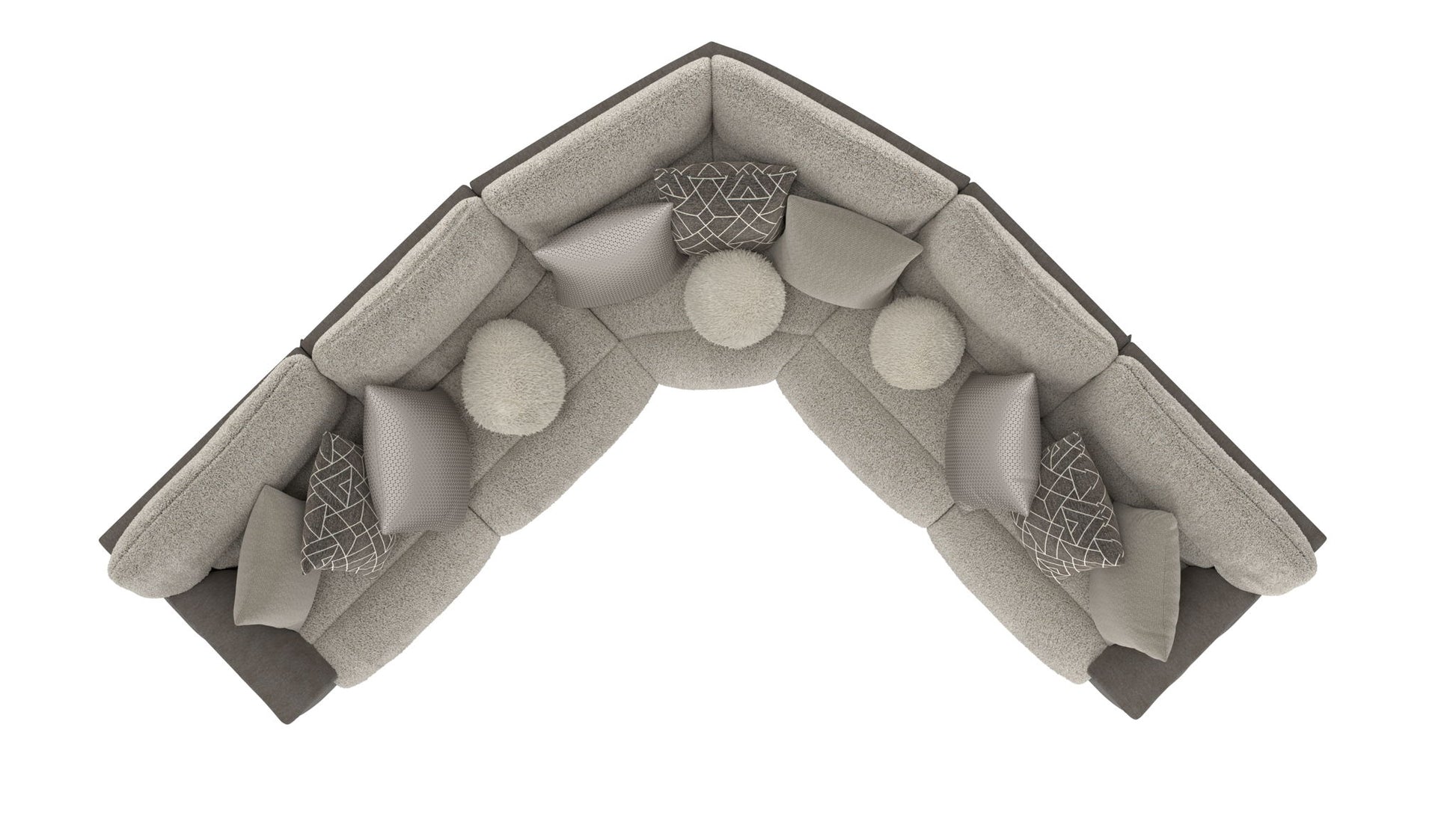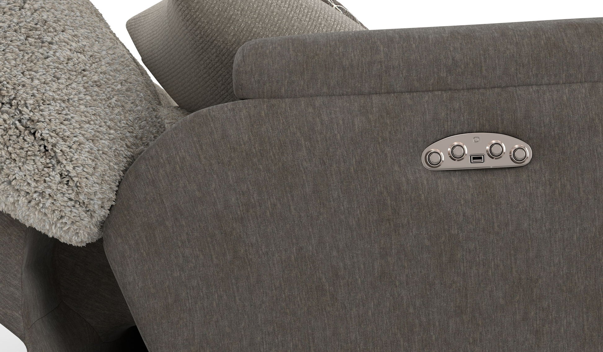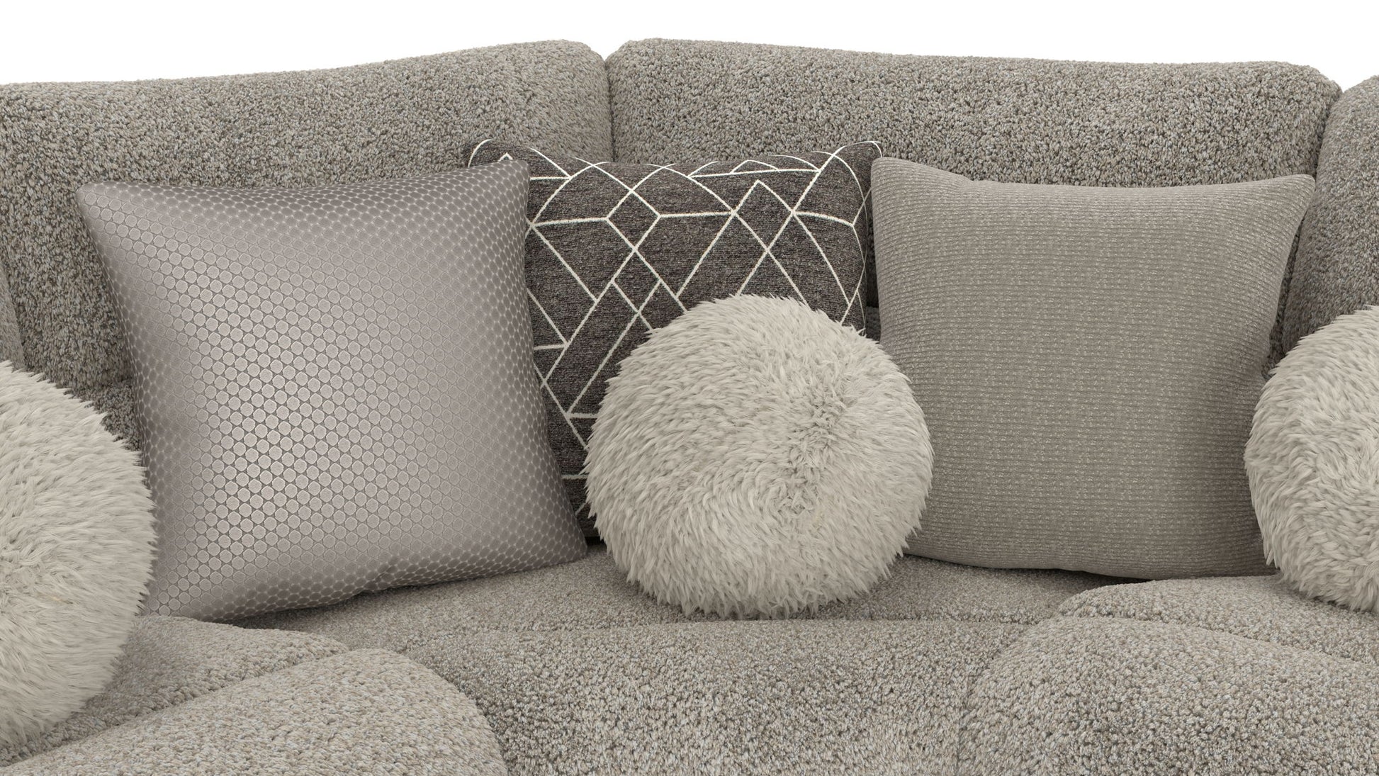 Rendezvous is a Reclining Modular Sectional that the ultimate comfort of our Power Headrest feature. This dual-fabric application is accented with an ecelectic mix of toss pillows in a variety of textures - including a sphere pillow in a luxurious faux fur. Rendezvous includes a convenient Castered Cocktail Ottoman and is available in one color combination: Slate/Fawn.