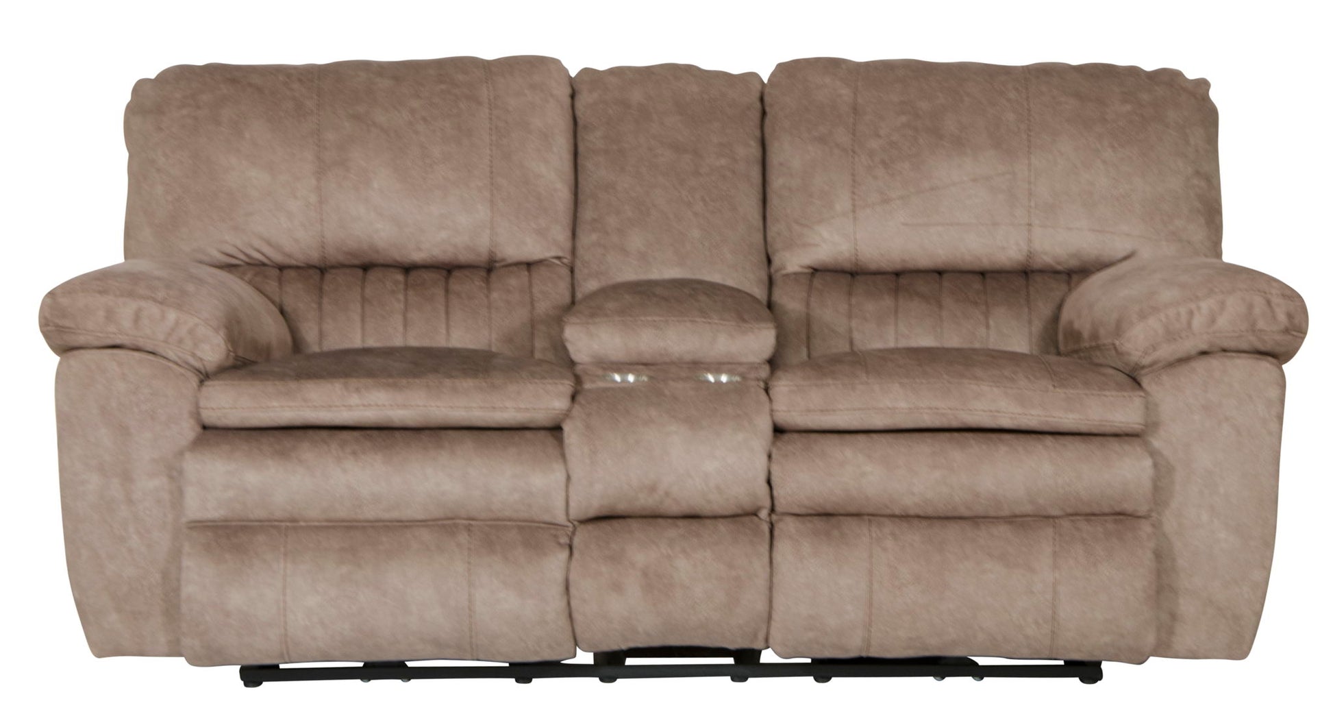 Style and comfort best describe the Reyes dual lay flat reclining console loveseat. Featuring heavy duty "lay flat" mechanisms this loveseat is ready for years of exceptional comfort. The lay flat mechanism allows full extension so you can really stretch out. Both seats feature individually pocketed coil seats encased in foam topped with a layer of cool gel memory foam and a box bordered pillow top for maximum comfort and support. The backs are filled with resilient plush polyester fiber to create a seating experience you won't want to leave. The Reyes console loveseat boasts stylish bold stitching details with a slight contrast to round out the look. The console contains convenient storage for remote controls and other small items. Keep your favorite beverage close at hand with the integrated cup holders.