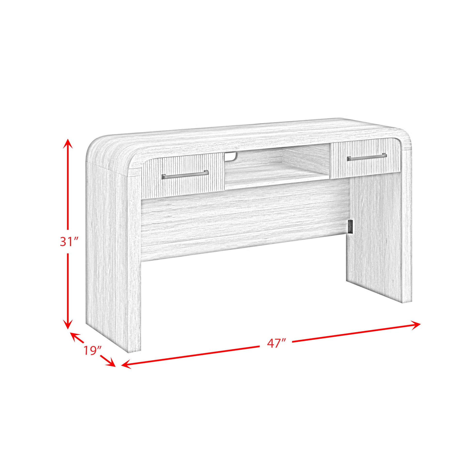 The Ridgemont Dressing Table exudes quiet sophistication with its seamless blend of structure and softness. A gently curved silhouette lends an air of elegance, while the natural wood finish adds warmth and depth. Fluted detailing on the drawer fronts creates a striking focal point, accentuated by sleek metal handles for a touch of modern refinement. Thoughtfully designed with both open and concealed storage, this vanity keeps essentials within reach while maintaining a clean, uncluttered aesthetic. Whether as a morning retreat or a bedroom accent, the Ridgemont Dressing Table is a refined addition to your space.