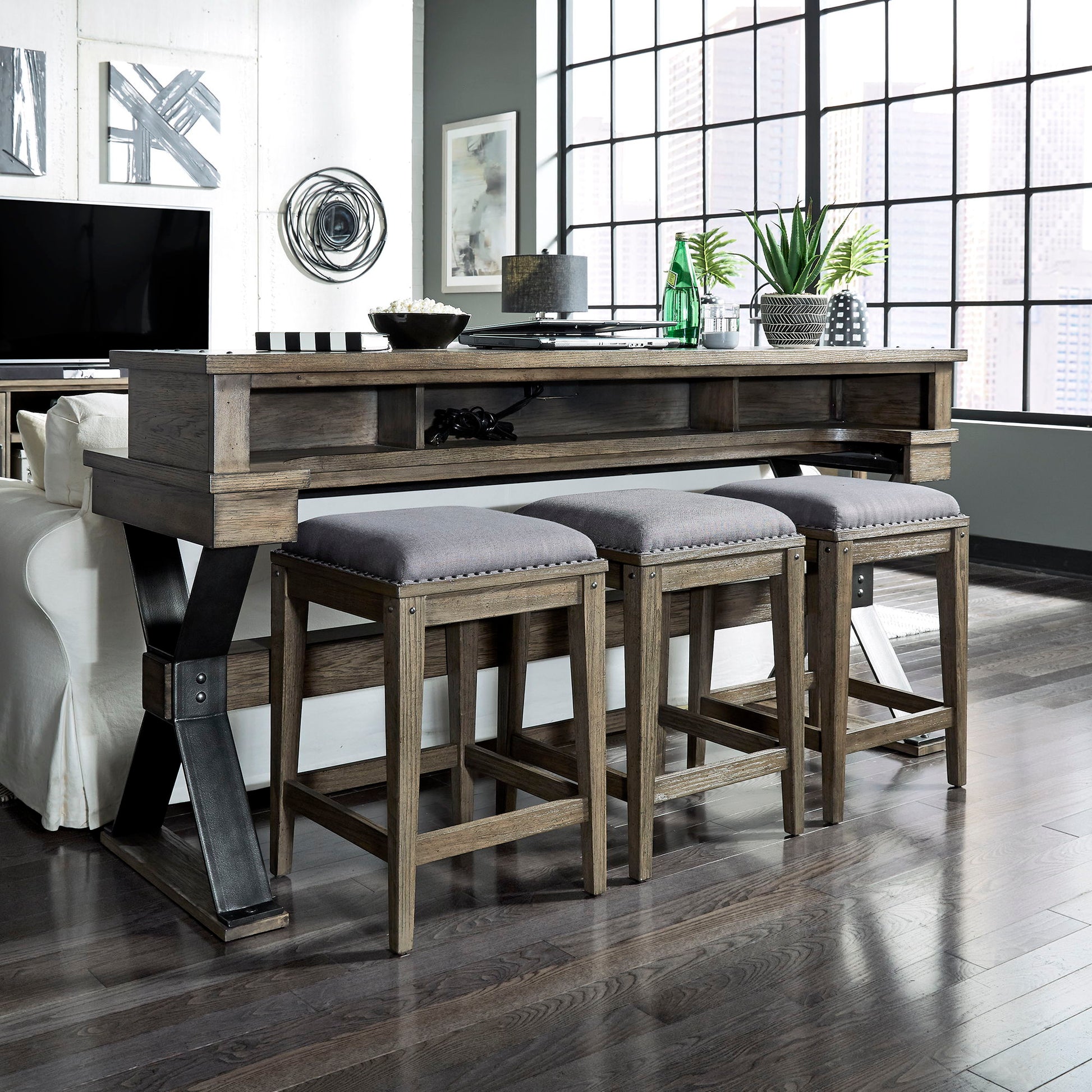 Live life beautifully with Sonoma Road industrial rustic design. Crafted of poplar solids with cathedral hickory veneers with a weathered beaten bark finish Features antique pewter metal, nail head accents, anchored by X base block style trestle design and two USB ports for easy access charging. Stool feature padded upholstered seats with nail head accents. Perfect for behind your sofa or kitchen nook. It pairs well in farmhouse to modern rooms and the entire collection will make a statement in your home. Kit consists of one console bar and three console stools.