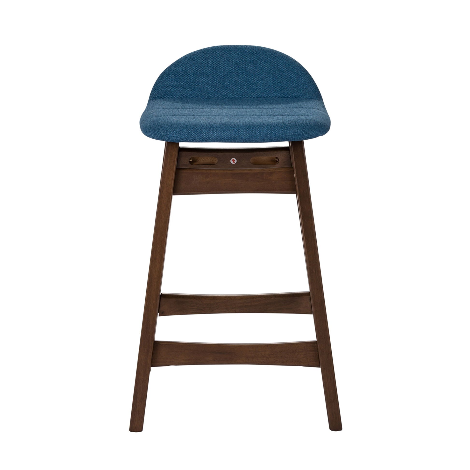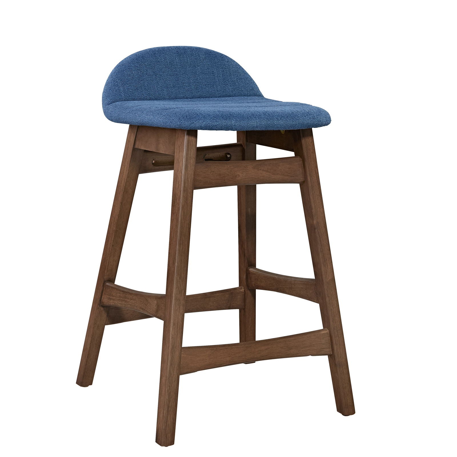 Do not sacrifice style while saving space with the Space Savers five-piece gathering table set. Crafted of rubberwood solids and walnut veneers, this set features a satin walnut finish and consists of the gathering table and four counter height chairs with blue jean denim upholstery. The gathering table has a fixed round top that is anchored by splayed legs with a softly rounded edge and an X style center stretcher. The Space Savers collection allows for contemporary, trendy looks in today’s casual finishes.
