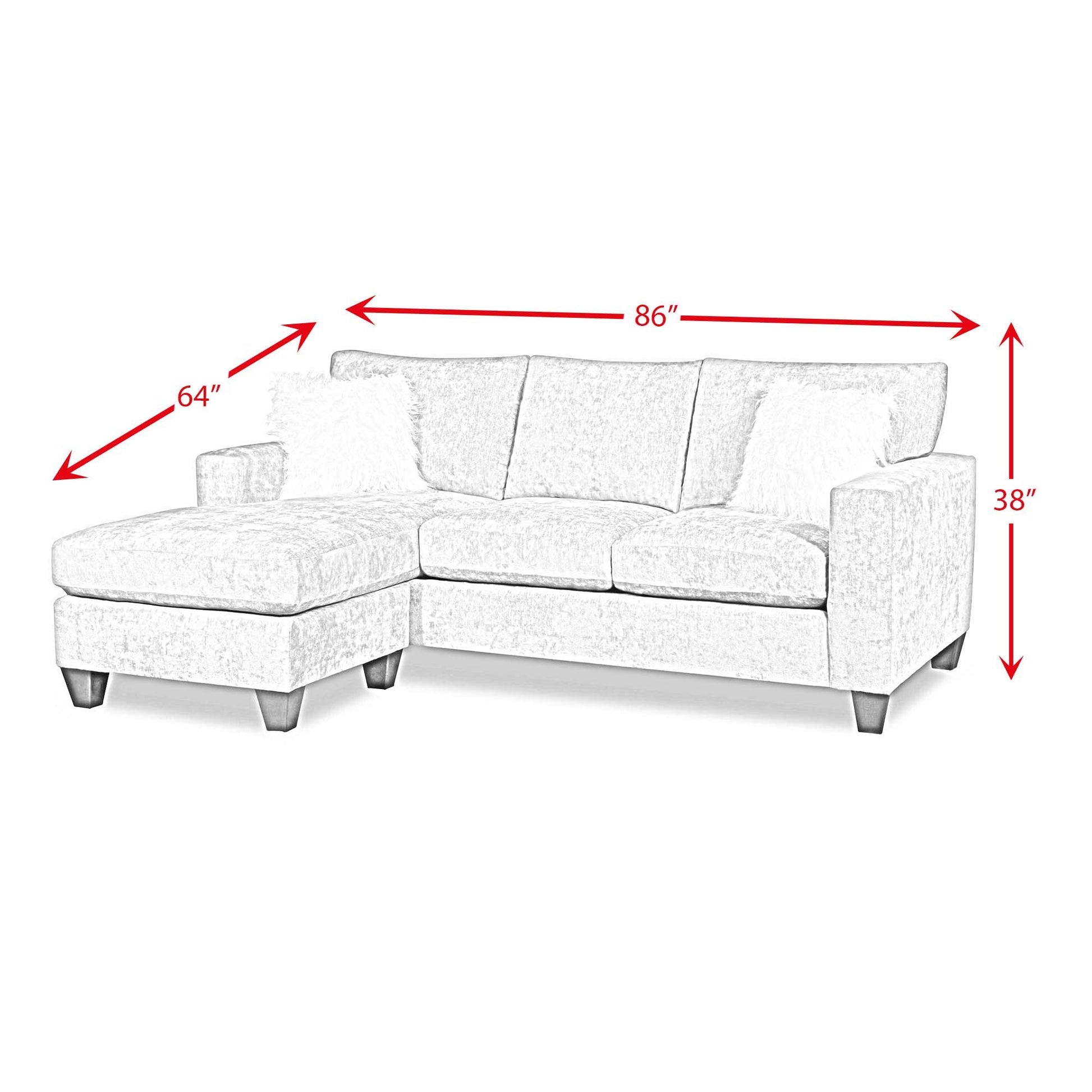 For modern comfort, add this stylish sofa and chaise set to any small living space. The reversible seat cushions and chaise allow you the flexibility to have the chaise on either side of the sofa, ensuring a perfect fit in any space. The overstuffed cushions, supported by a solid wood frame, guarantee years of comfy lounging, and two white faux fur throw pillows are the perfect finishing touch.