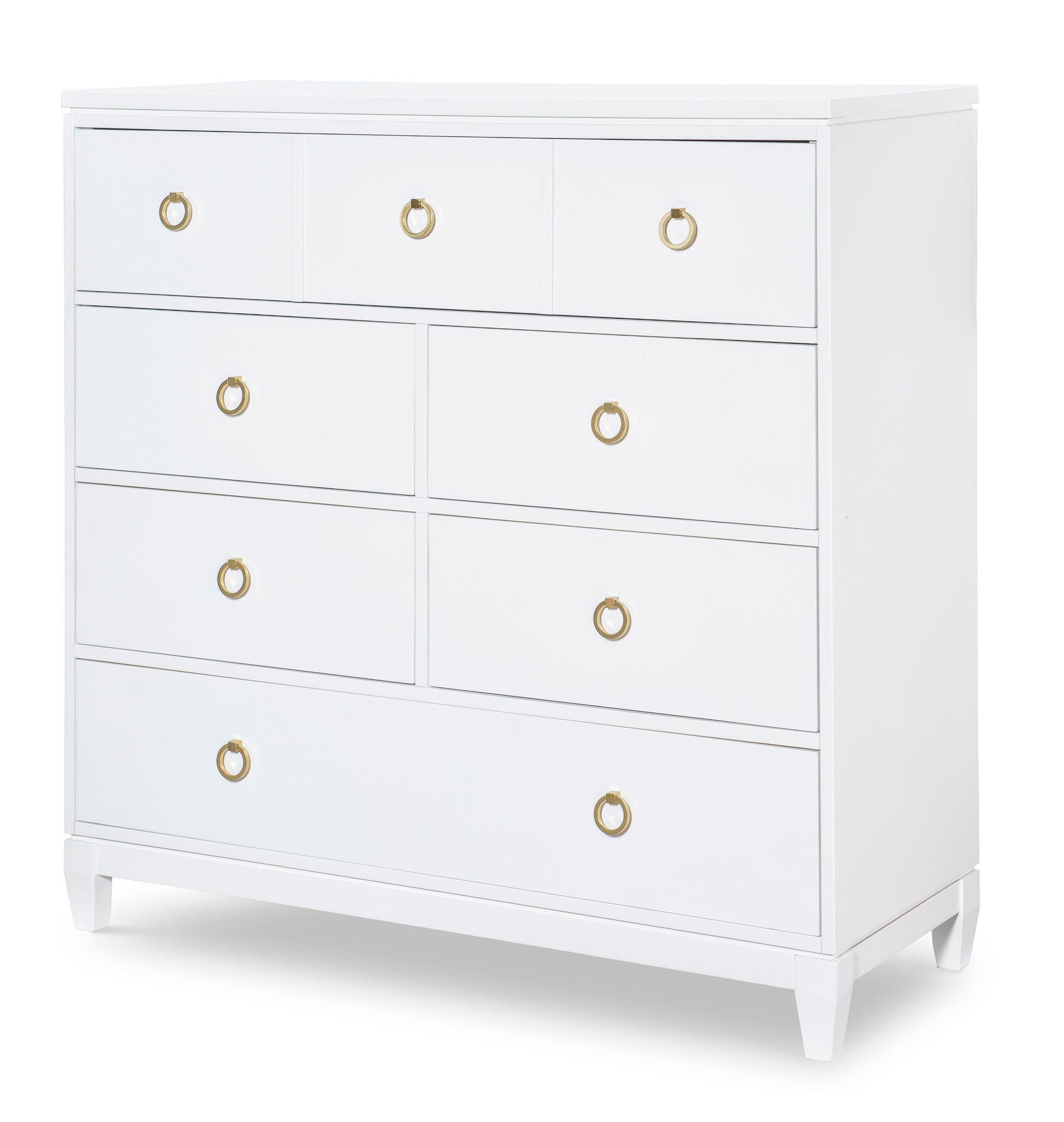 The Summerland Bureau Offers Eight Drawers, Felt-Lined Top Drawers, RSF Drawer with Jewelry Tray, Cedar-Line Bottom Drawers. Elements such as floating tops, tapered feet, flat drawer fronts, and simple shapes lend the perfect backdrop for easily creating a beautifully styled space. The pieces and scale of Summerland allows multiple options for a modern, livable style.