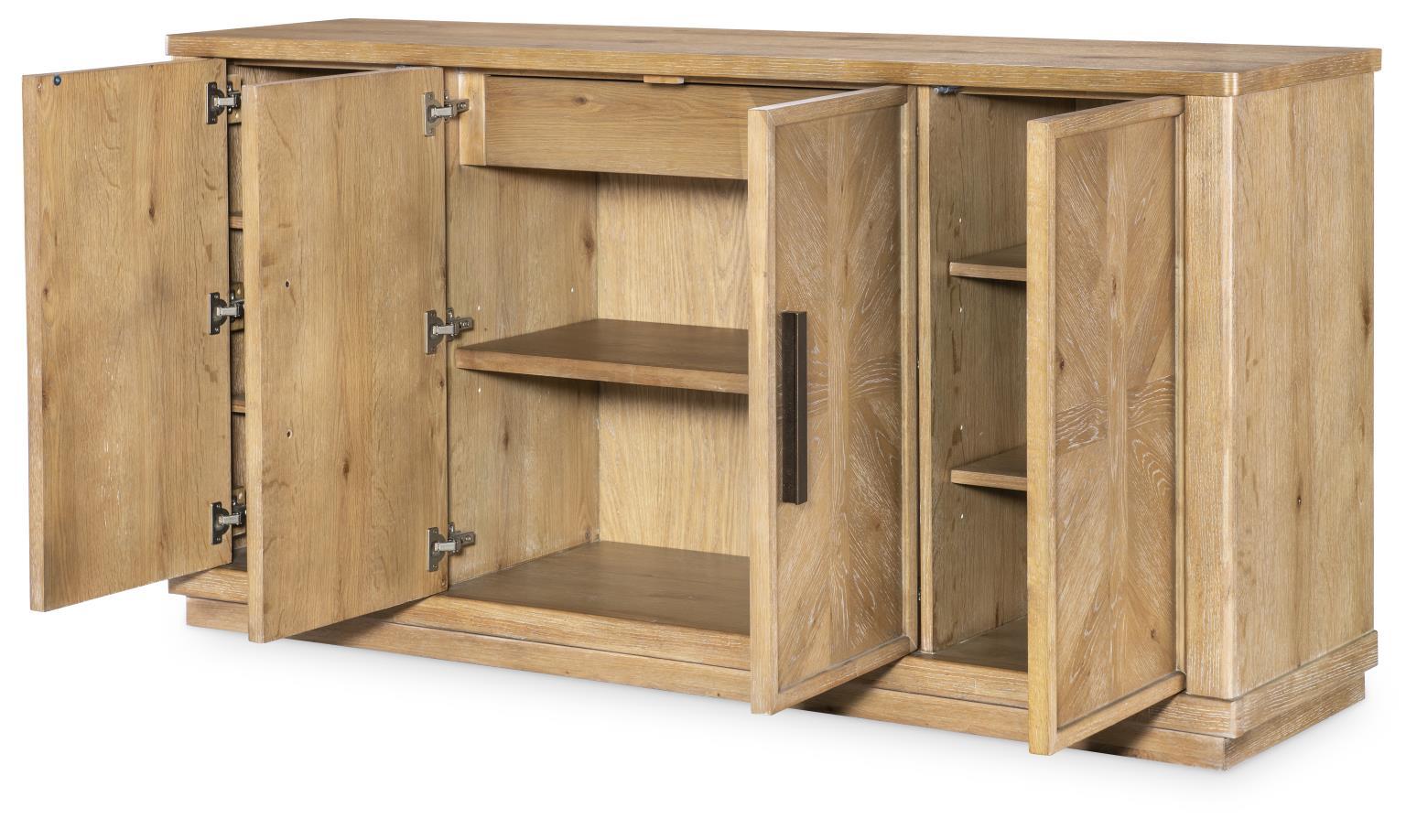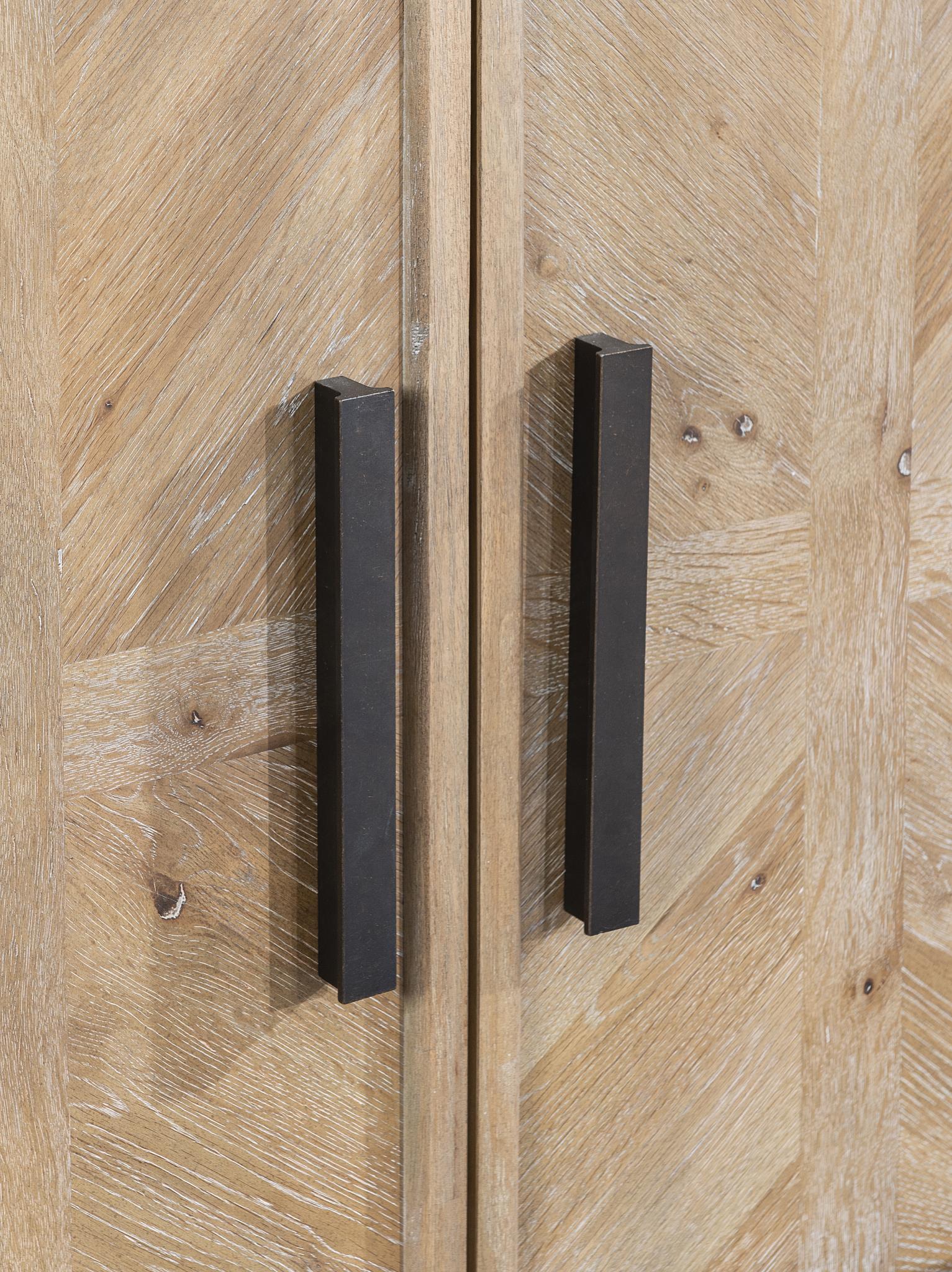 The Torrance whole home collection offers a warm and inviting contemporary casual design with an organic Aged Driftwood finish and a California coastal vibe. Crafted of random match White Oak with Split Heart Cathedral Veneers in a herringbone pattern on the drawer fronts and tabletops,, the bedroom,, dining and occasional pieces have clean lines,, plinth bases and a light and airy tone. Oxidized Bronze hardware adds a rustic elegant touch.