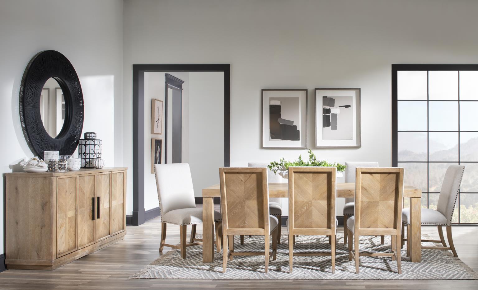 The Torrance whole home collection offers a warm and inviting contemporary casual design with an organic Aged Driftwood finish and a California coastal vibe. Crafted of random match White Oak with Split Heart Cathedral Veneers in a herringbone pattern on the drawer fronts and tabletops,, the bedroom,, dining and occasional pieces have clean lines,, plinth bases and a light and airy tone. Oxidized Bronze hardware adds a rustic elegant touch.