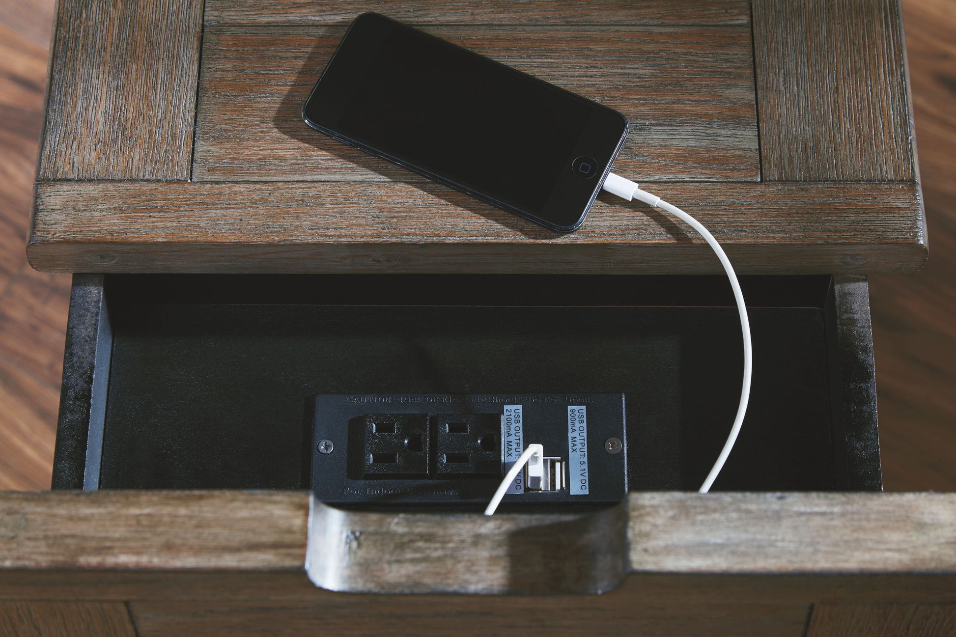 Shabby chic with a hint of down-home country, this chairside end table is all the talk of today’s design world. Wood grain shows through the weathered gray-brown top in all of its earthy pleasure. A pull-out tray with lovely traditional hardware has two cup holders. Fuel up your devices with the convenient charging station.
