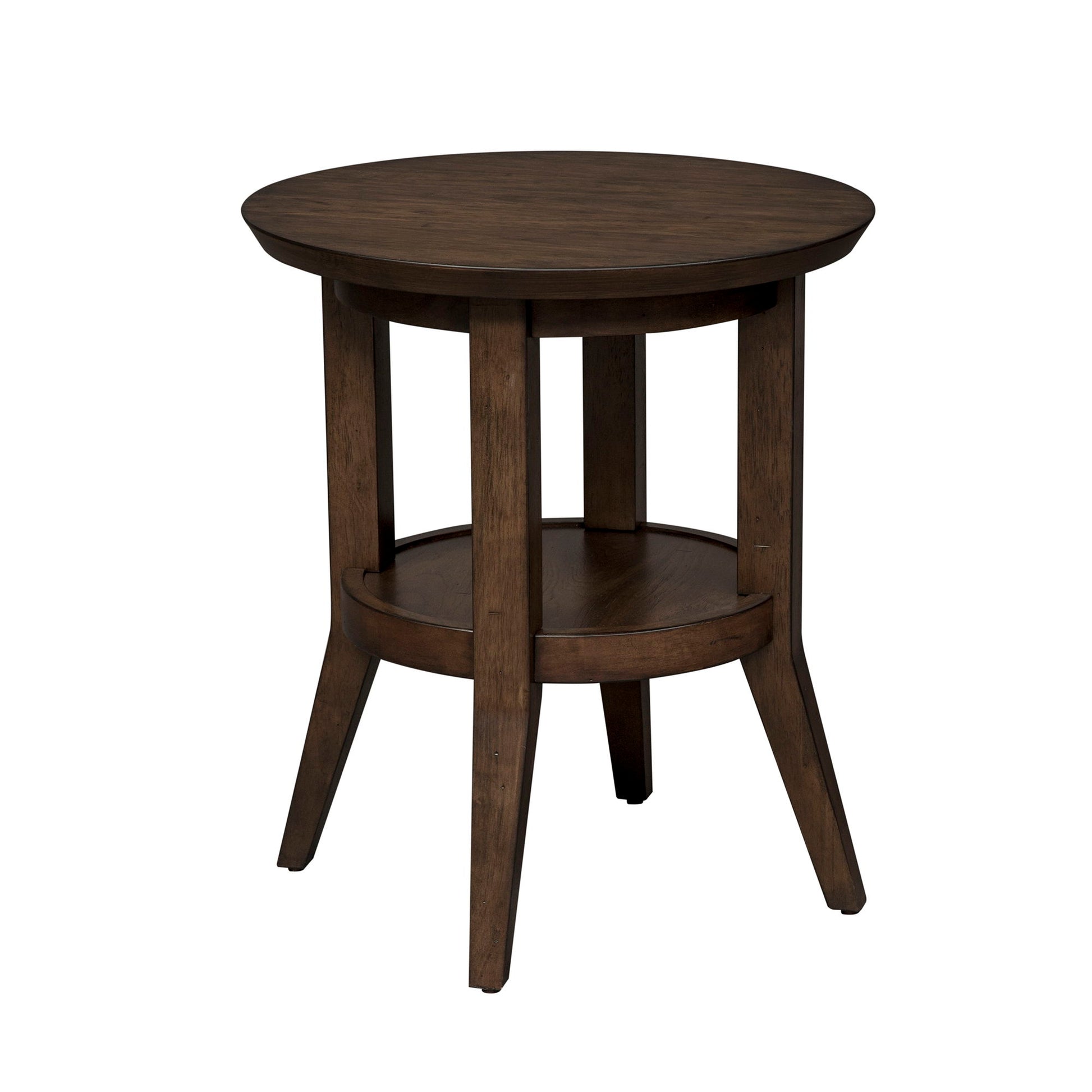Elevate your space with the Ventura Boulevard round end table. Crafted of rubberwood solids and cathedral walnut veneers, this piece features a bronze spice finish, bottom shelf for additional storage, anchored by tapered splayed legs. This contemporary end table would be a wonderful addition to any space.