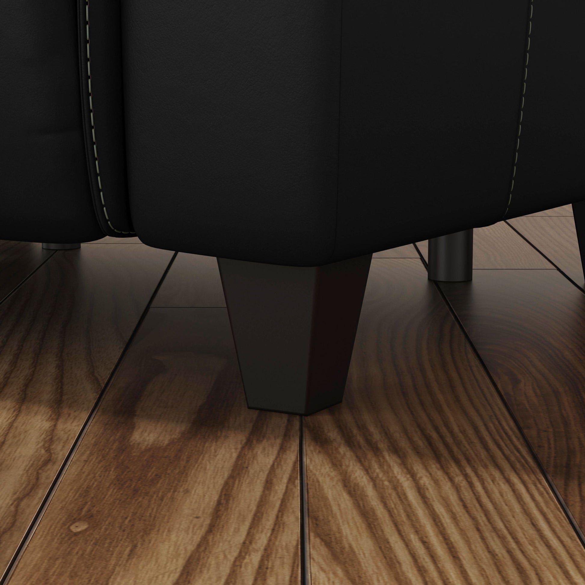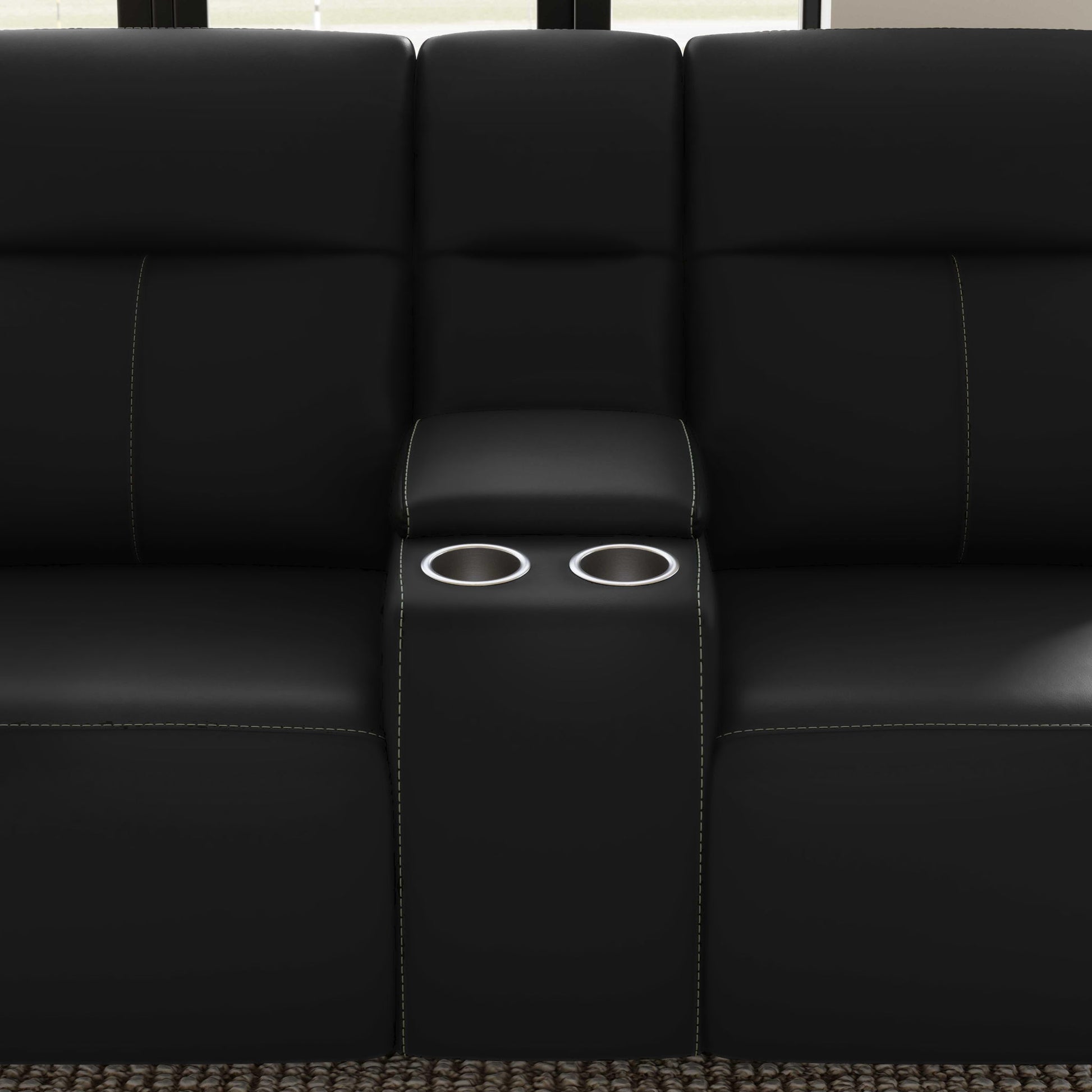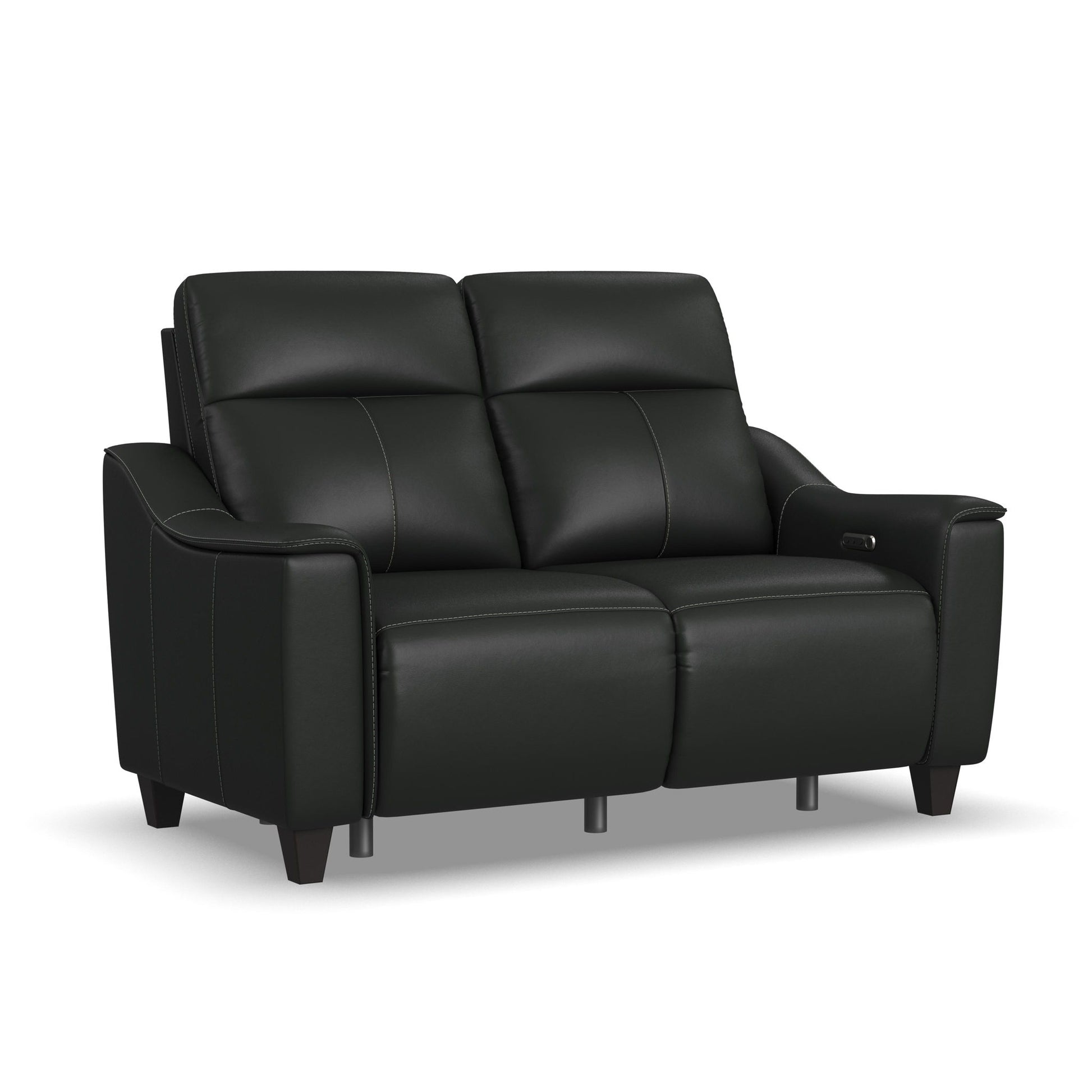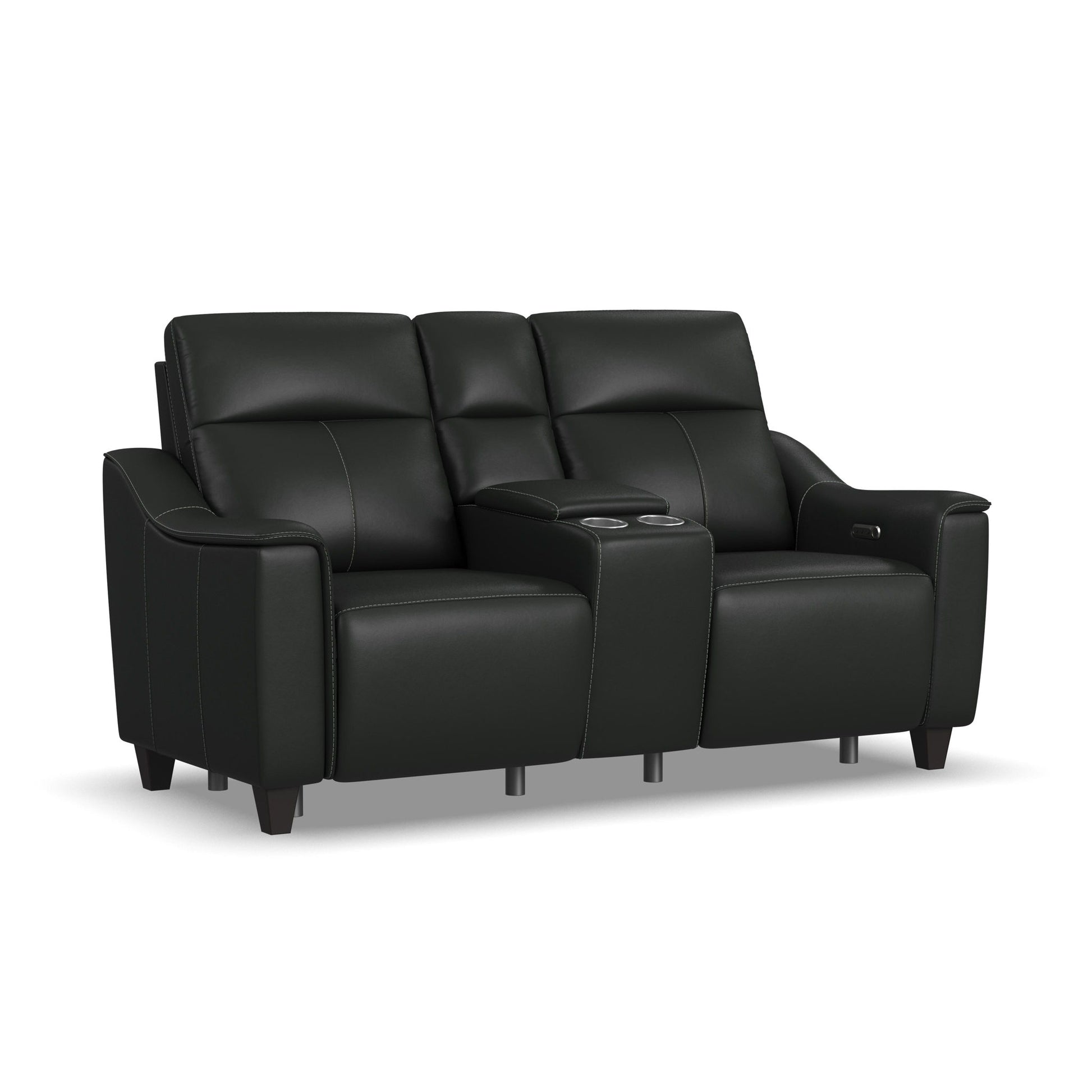 Alluring modern style merges with motion technology in the Walter leather power reclining loveseat with console. Featuring thin, pad-over sloped track arms, square tapered legs, and flat seats, Walter mirrors the look of high-end stationary furniture. Relaxation can be fine-tuned with an adjustable recline, powered headrests, and extended footrests, while high, divided backs support shoulders. Conveniently store drinks and remotes within reach and charge devices with built-in ports. Upholstered in a high-quality, coal black leather, the Walter power reclining loveseat is designed for lasting beauty.