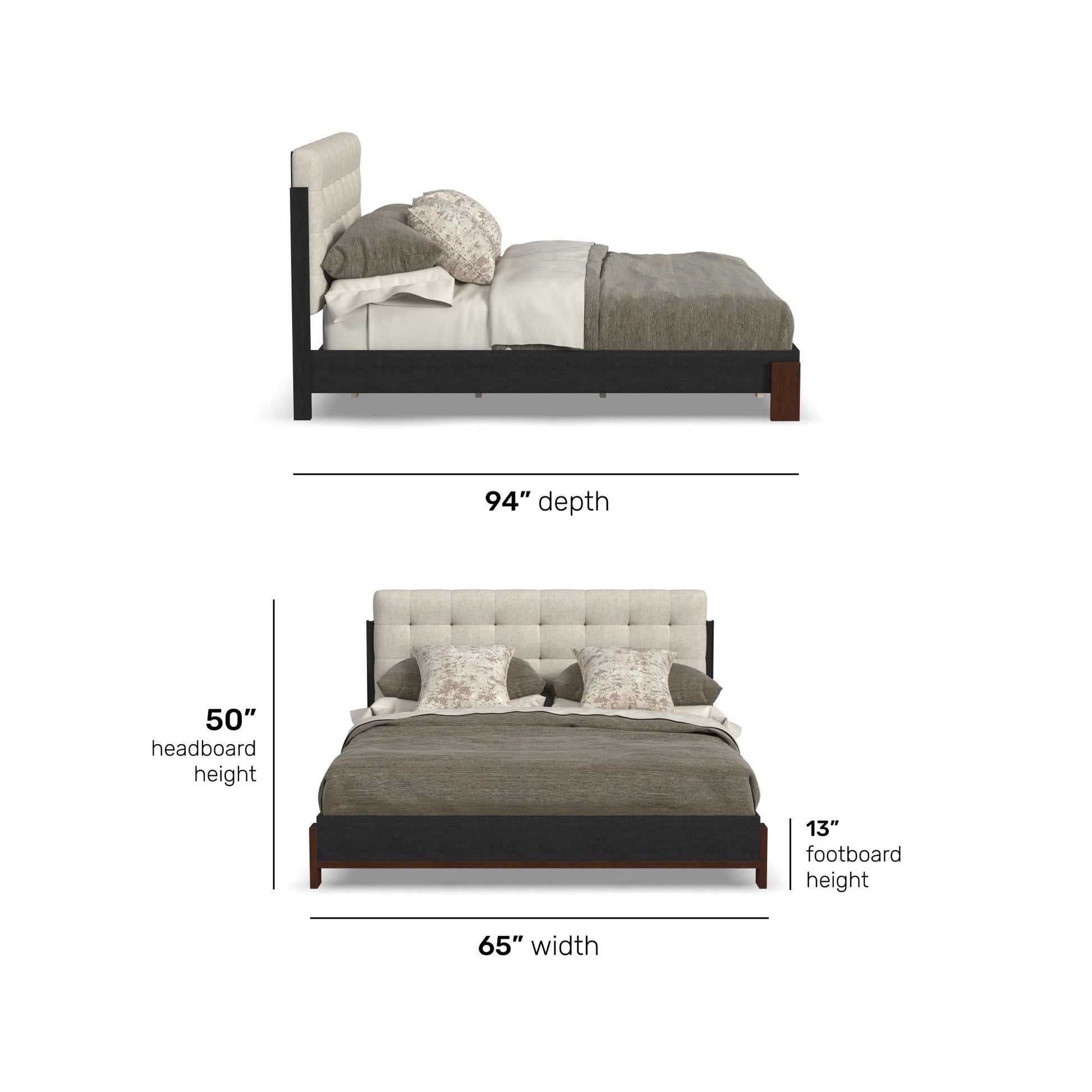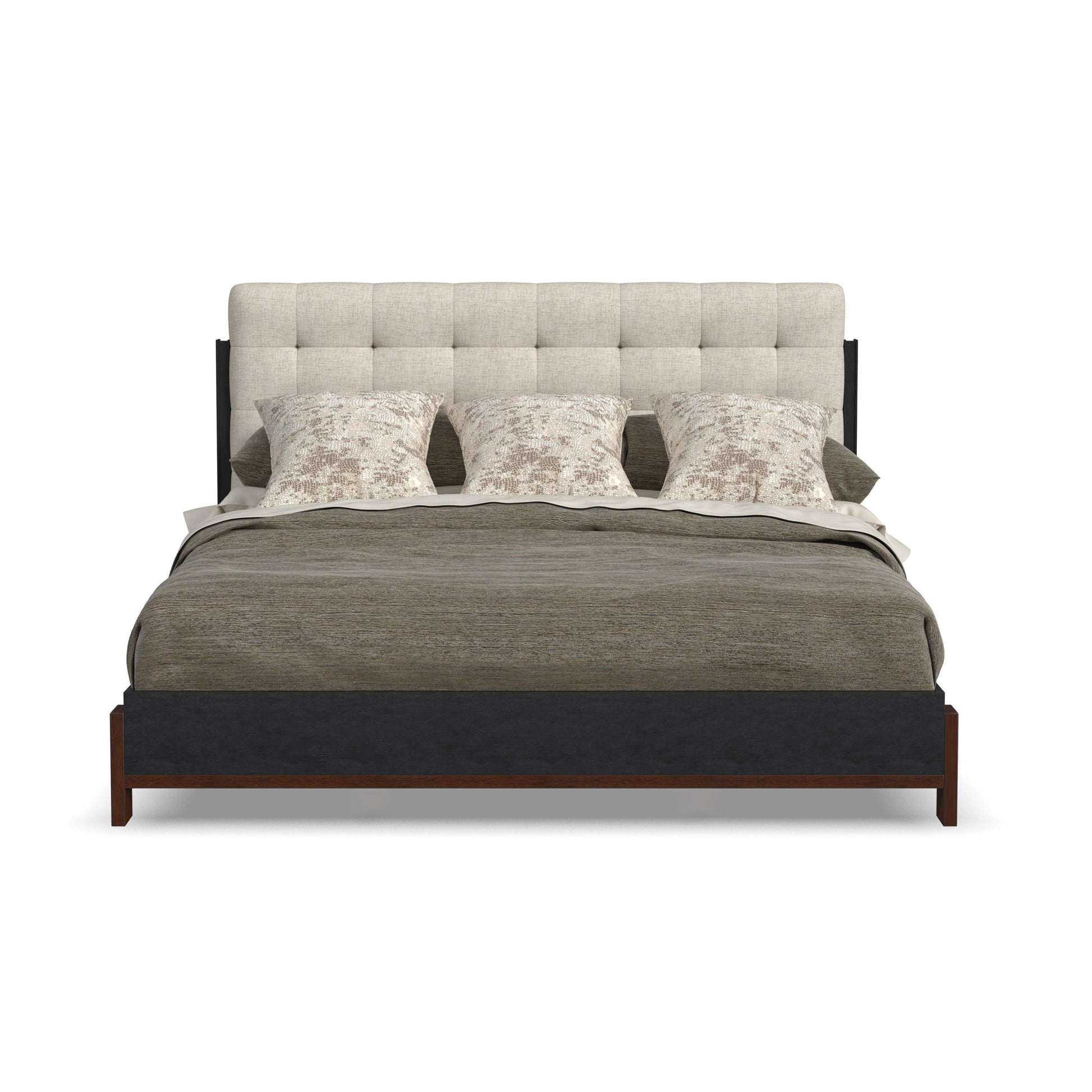Add effortless style and architectural appeal to your bedroom with the Waterfall King upholstered bed. This platform-style bed features a timeless silhouette defined by clean lines and simple geometric shapes. Dark brown-finished base accents add a striking contrast to the deep ebony finish, while the elegantly tufted headboard brings an element of softness to the aesthetic. Expertly crafted from solid rubberwood and oak veneers, and upholstered with sustainable performance fabric, the Waterfall King bed offers lasting beauty you can feel good about.